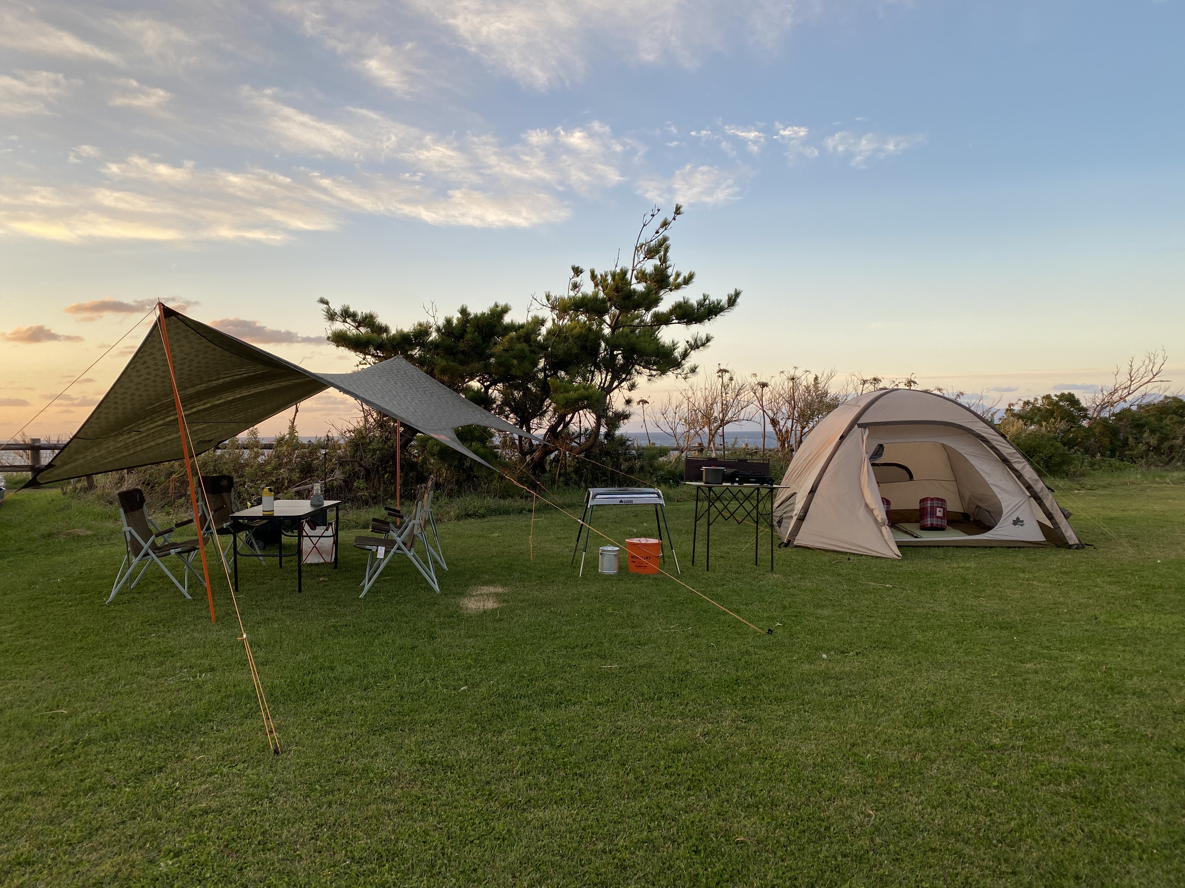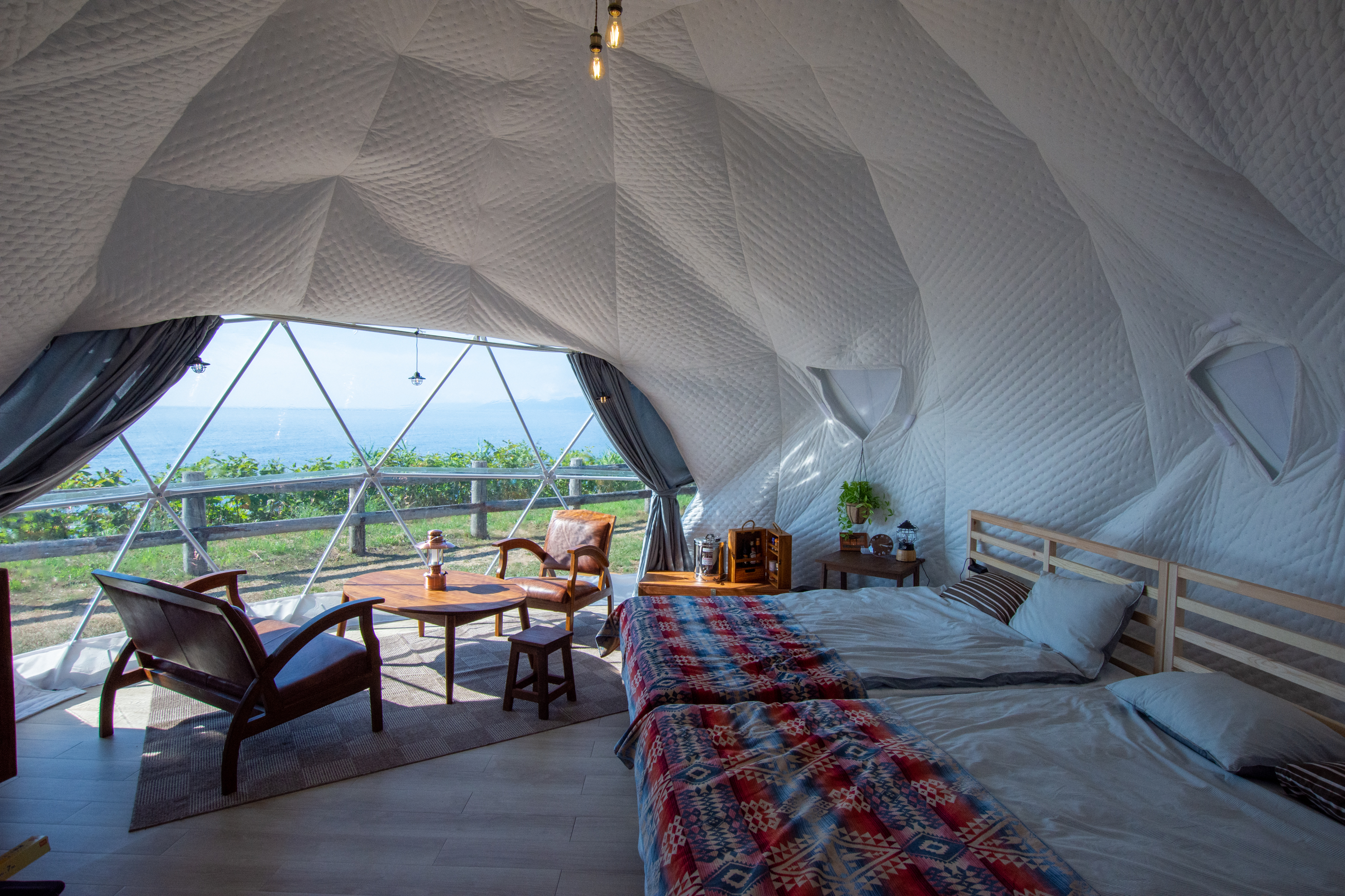 かもめ島の上で宿泊する環境を構築するために、グランピングテント1棟・ウッドデッキ1基、および手ぶらキャンプ用レンタル用品5セットを設置・導入した。 |