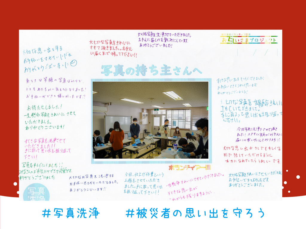 活動報告書_2021年度_12月 被災支援ボランティア団体 「おたがいさまプロジェクト」 被災支援ボランティア団体「おたがいさまプロジェクト」の2021年12月の活動報告になります。 倉敷市真備町の児童館でクリスマス会を行い、神戸で、被災者の大切な思い出を守るため、泥で汚れた写真を洗浄しました。 ※新型コロナウイルス感染拡大防止対策を徹底しての活動となりました。 現地支援活動 日時/場所 ボランティア数 2021年12月4-5日 / 長野県小布施町(6名) 2021年12月18、25日 / 岡山県倉敷市真備町(2名、4名) 対象被災者数 約65名 B. 約12名 内容 子ども支援 / 傾聴活動 / 写真洗浄 / 防災セミナー その他 JR西日本あんしん社会財団(真備町)、神戸市(長野市)の助成事業です。 新型コロナ感染症対策のため、少人数での活動となりました。 詳細 神戸写真洗浄 日時/場所 ボランティア数 12月11日(土)10:00~12:00、13:00~15:00 @ 神戸市 延べ23名 受益対象地域 受益対象者数 作業枚数 栃木県栃木市 約20名 197枚 支援・協力団体 真備町写真洗浄@あらいぐま岡山(作業指導等) 追手門学院大学 社会福祉部(協力) 内容 ①写真洗浄 ②プチ防災セミナー その他 コープともしびボランティア振興財団の助成事業になります。 |
