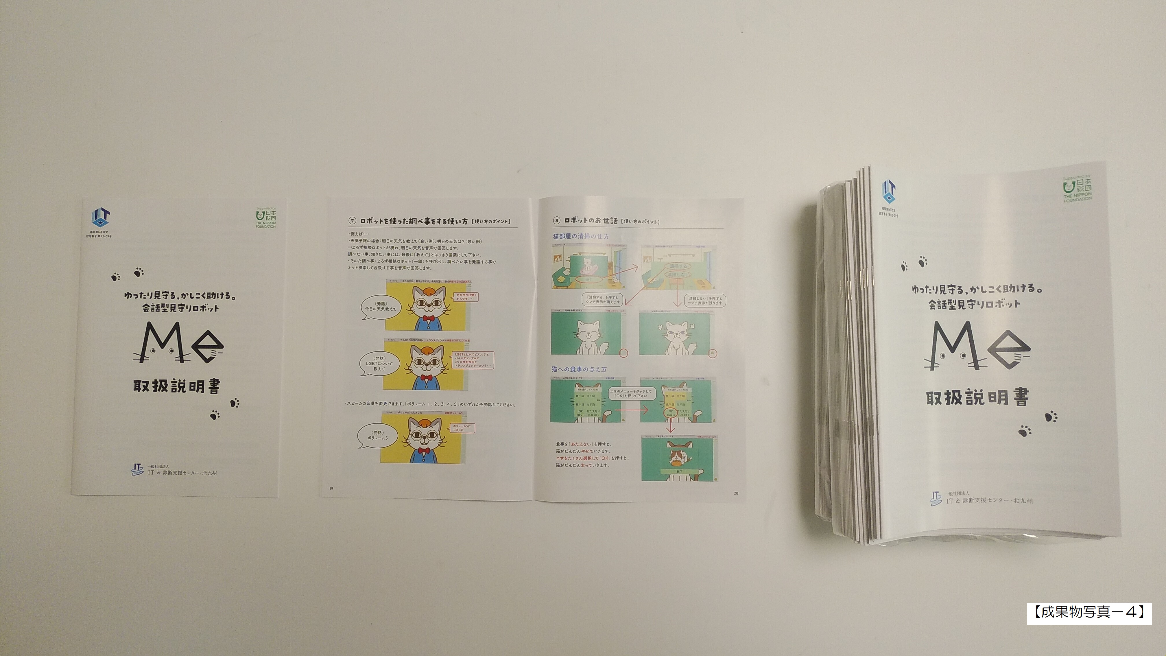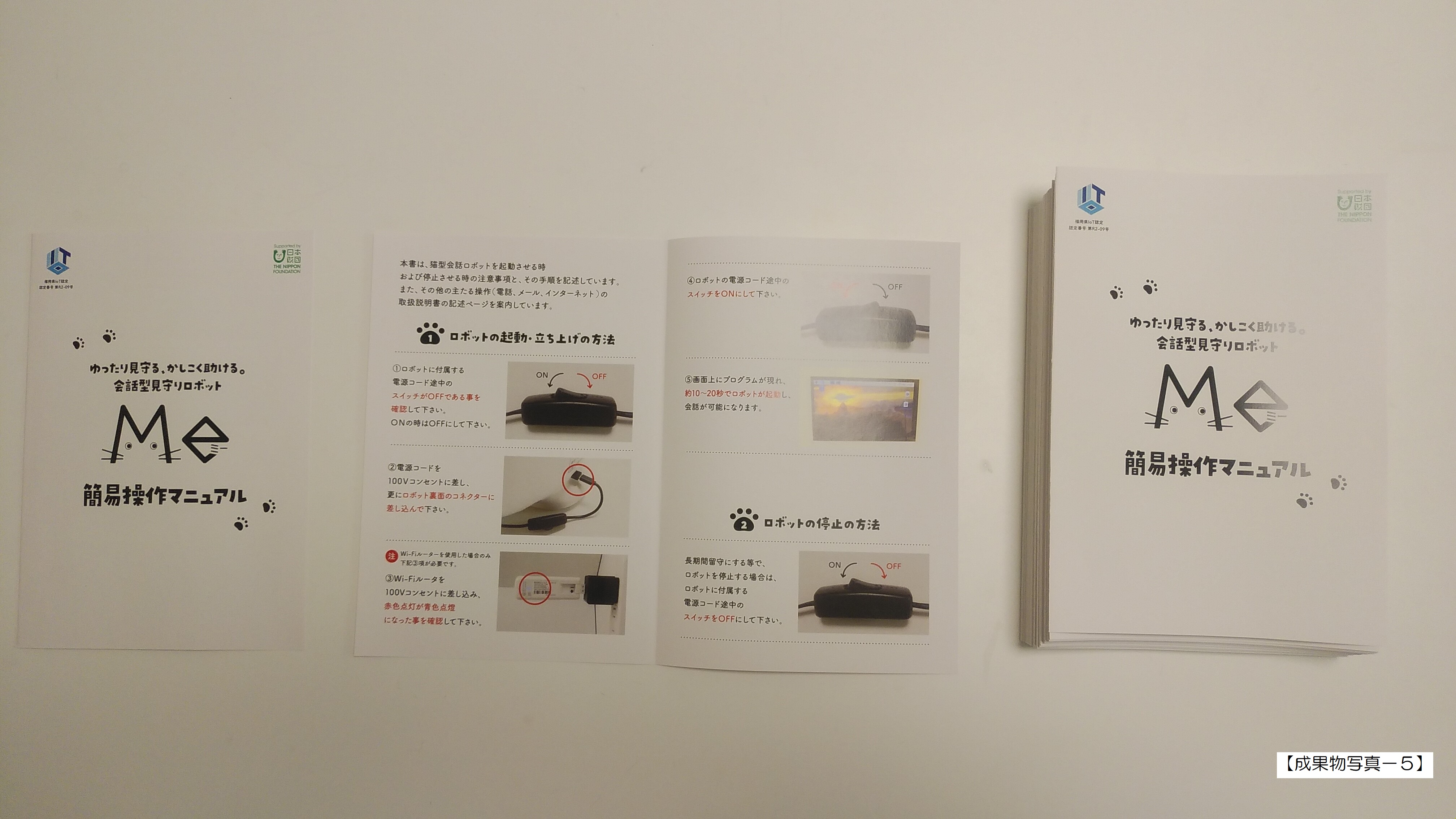 ・製造30台(出荷前検査を実施、全品合格を確認) ・上記30台の内、5台は実証実験向け。初期見込み(5月末完成)より3ヶ月遅延。次期改修検討&故障交換品として当社で保管中。(成果物写真ー1ー1、ー2) ・上記30台の内、25台は製品販売向け。初期見込み(順次完成で9月末完成)より1か月遅延。㈲北九メンテ・テクノ開発で保管中。(成果物写真ー2) ②.パンフレット(チラシ編)作成 200部(成果物写真ー3) ③.取扱説明書作成 100部(成果物写真ー4) ④.簡単操作マニュアル作成 100部(成果物写真ー5) ⑤.専用ホームページ作成 1式(成果物写真ー6) ⑥.穏やかな見守り概念の検証結果に基づく改修反映.改修機能書に基づく改修結果の測定・評価/猫型会話ロボット基本機能(雑談会話、猫の日常生活等)のアンケート 以上、実証実験の範囲での測定記録&評価書及びイメージ的納得感(成果物写真ー7) |