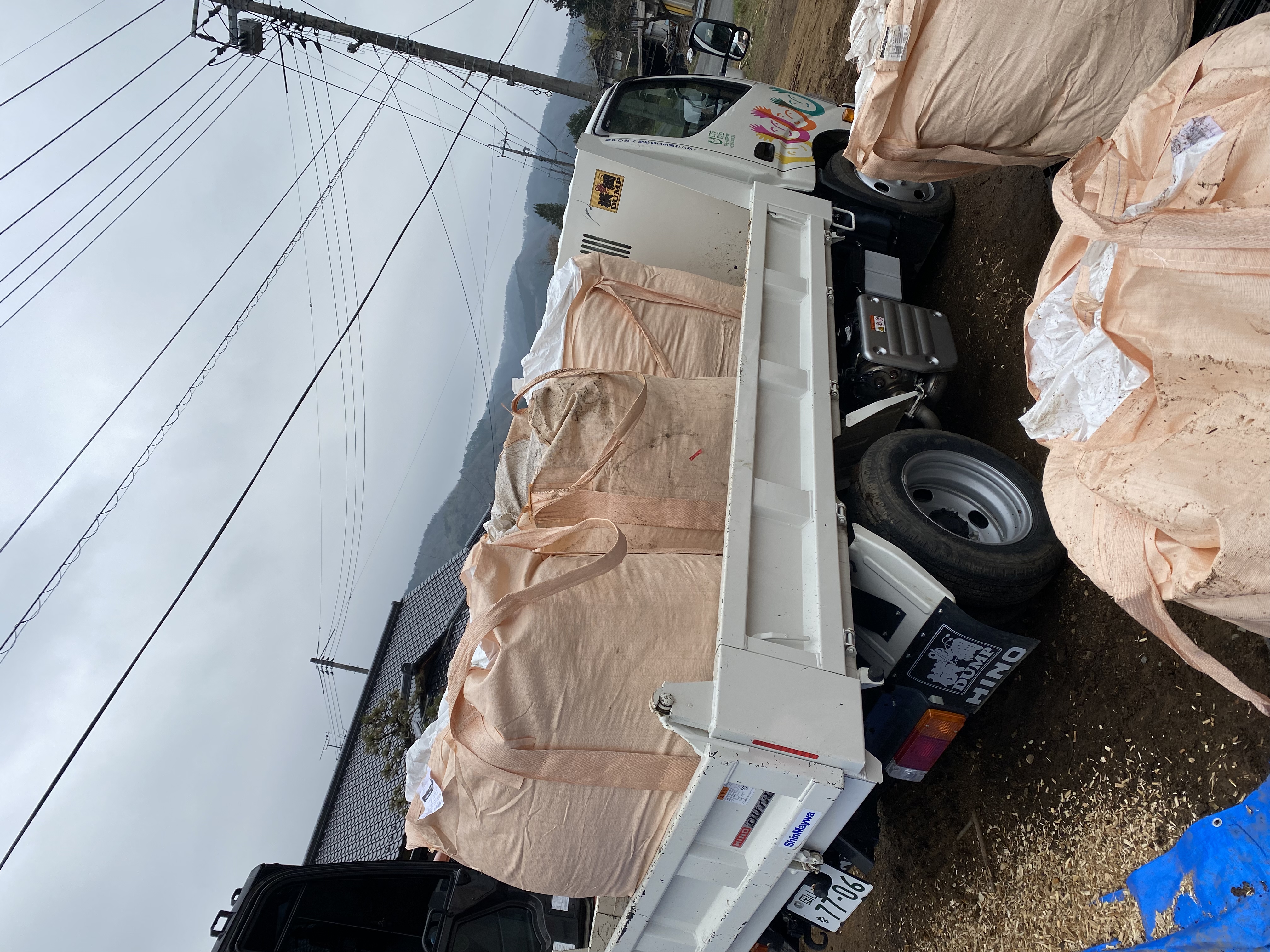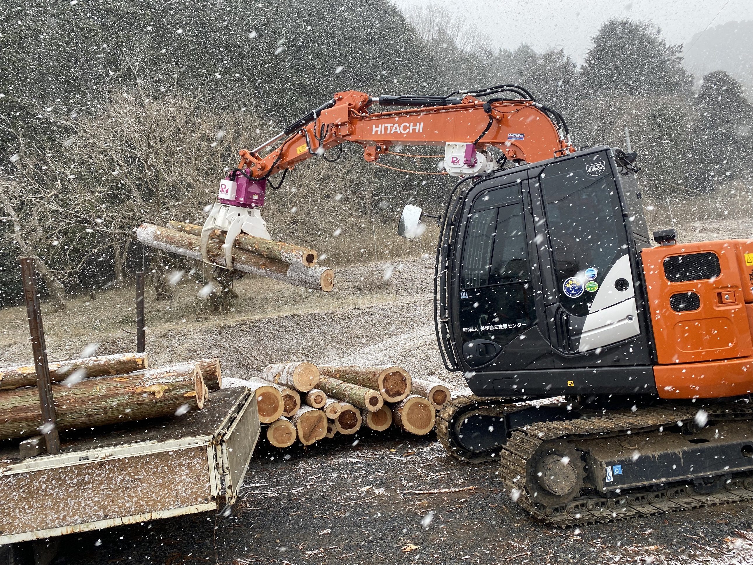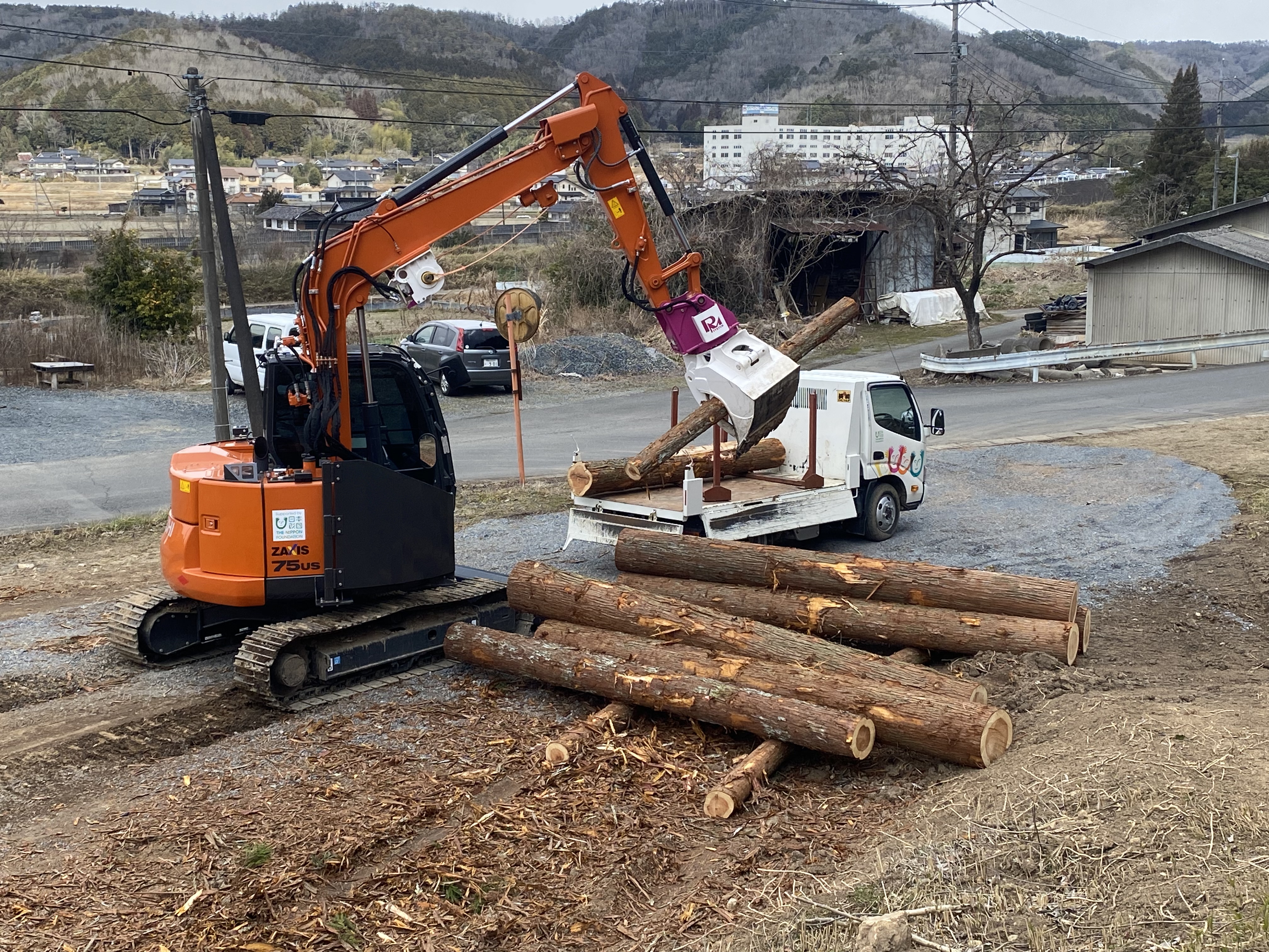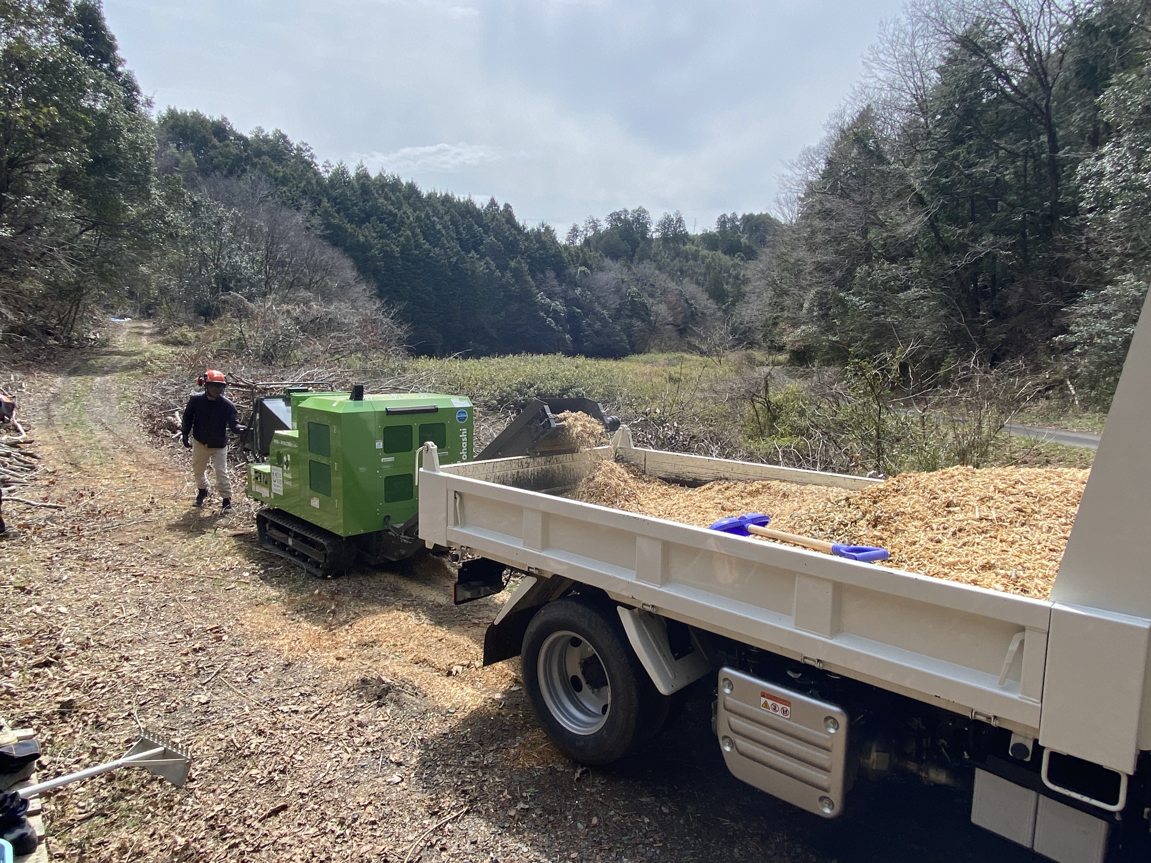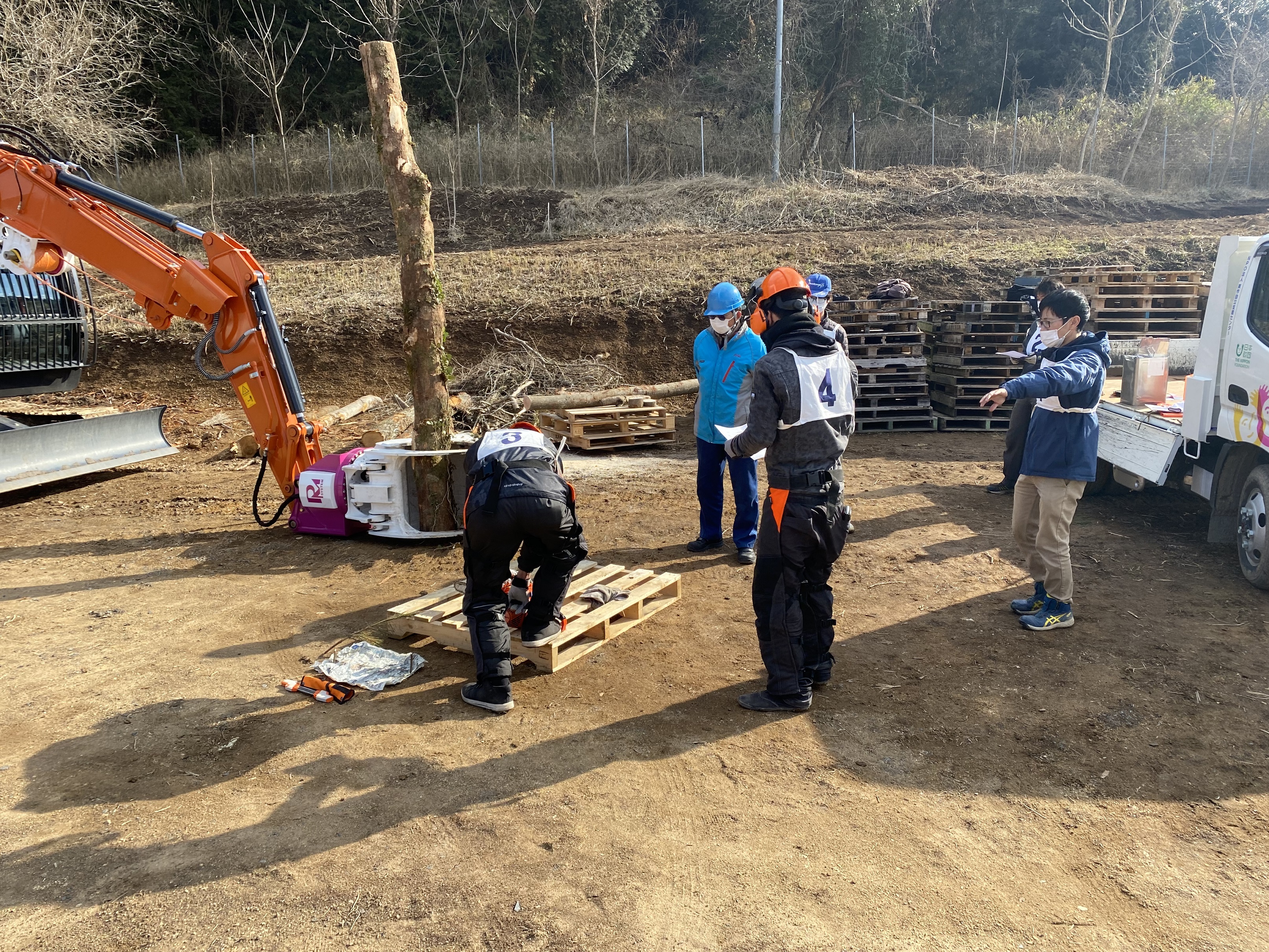 1、2 パワーショベルを用いて建材の荷下ろしを行っている様子 3 利用者3名指導員3名でチェーンソーの講習を受けている様子 4、5 チップに加工したものを2tダンプに積み込んでいる様子 |