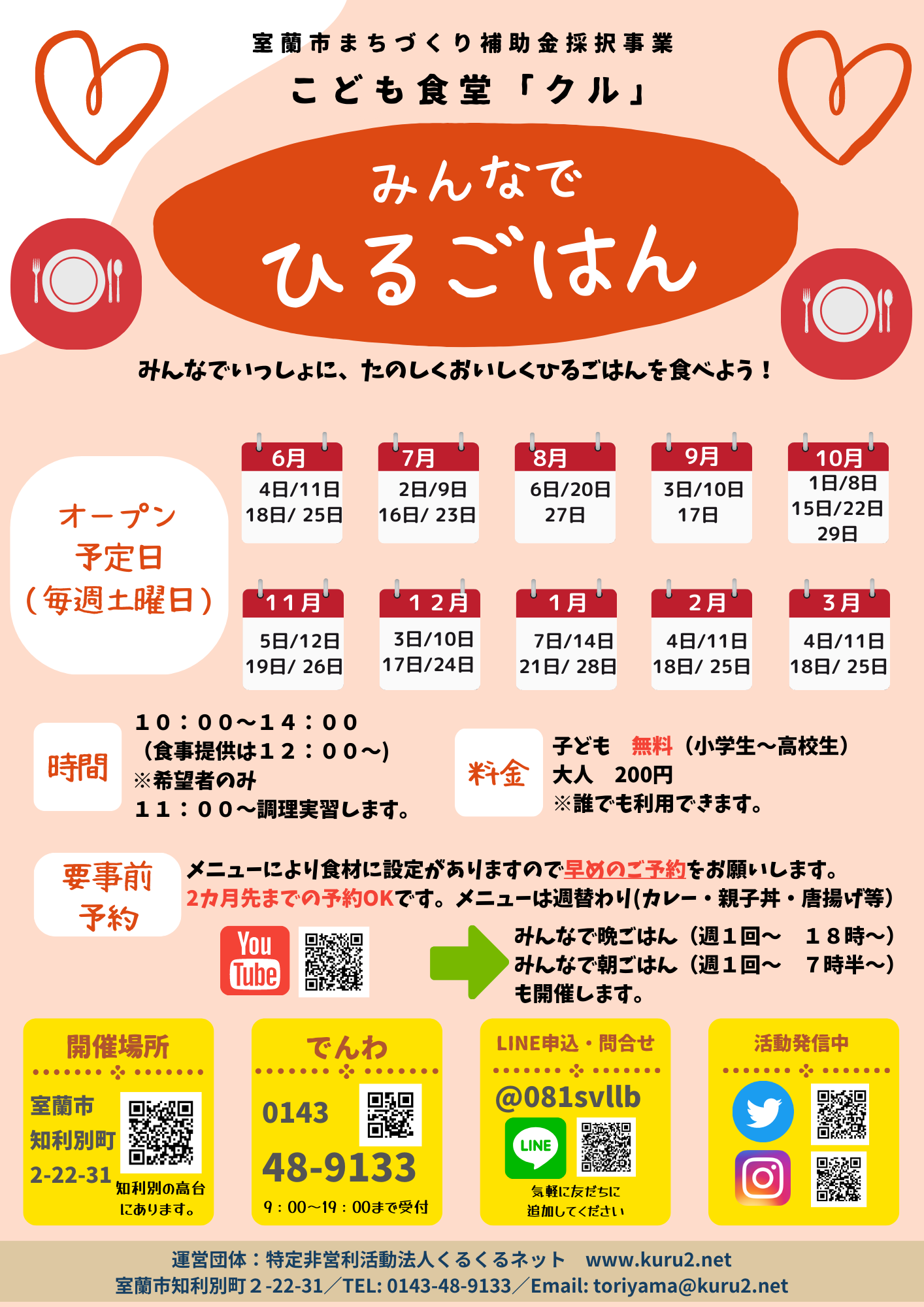 2022年北海道室蘭市子ども食堂「クル」開催予定一覧表
