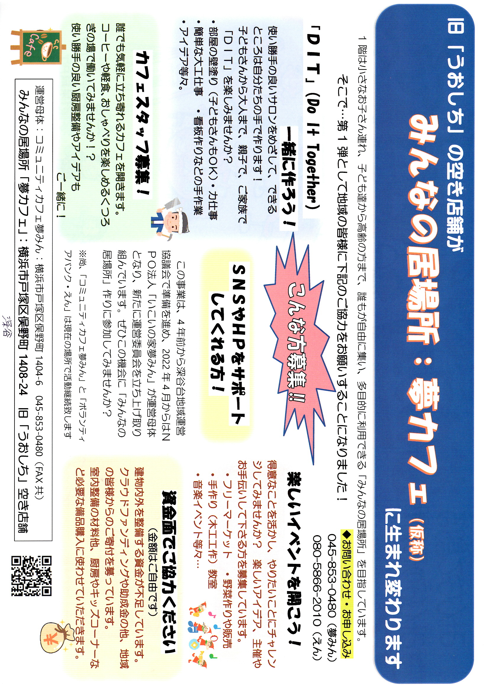 「みんなで創るみんなの居場所 『夢カフェ』(仮称)」をスタートさせました。 オープニングはもうすこし先になりますが、 広報紙第1号を発行し、ドリームハイツと 周辺に配りました。 ぜひホームページでも読んでいただき、 出来るところでぜひご参加・ご協力くださいますよう、 よろしくお願いいたします。 |