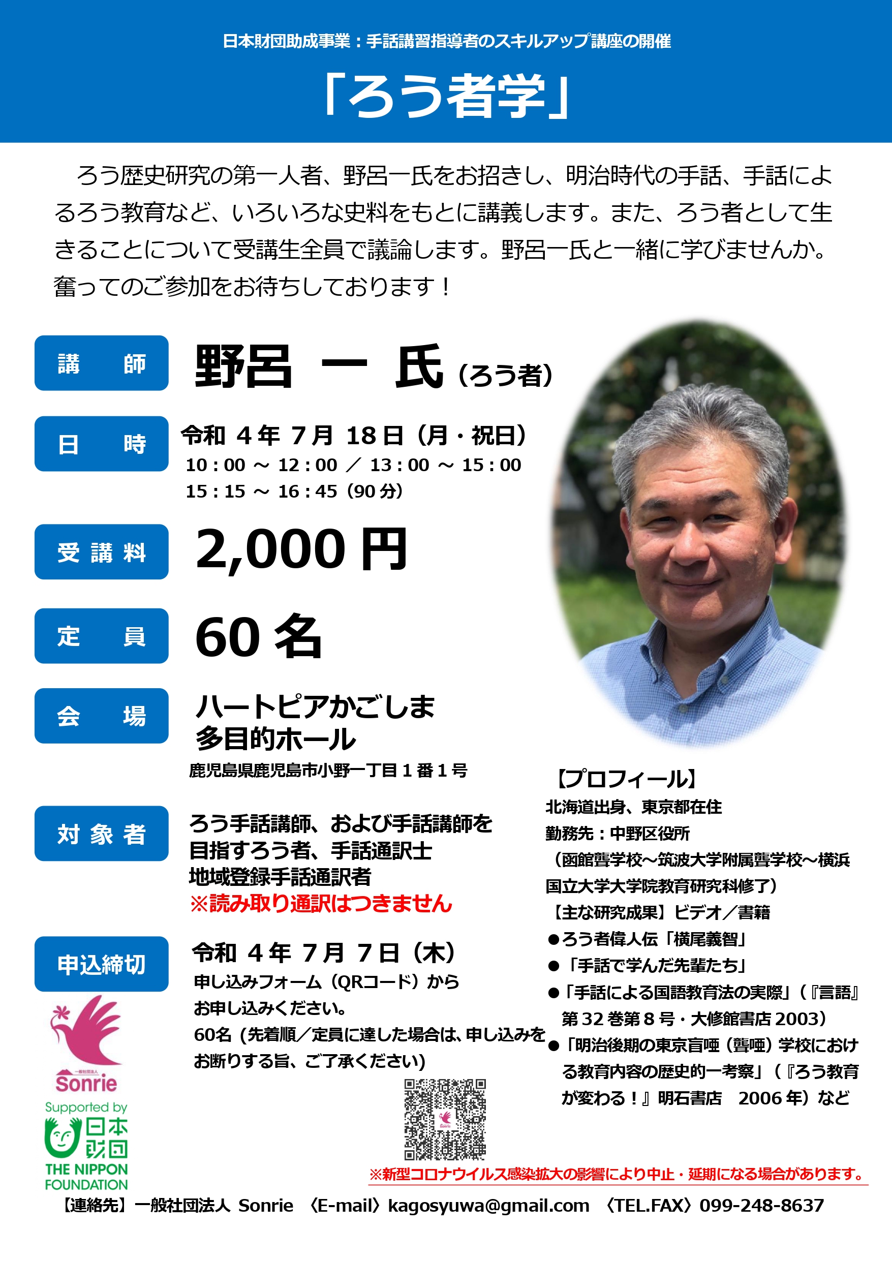 2020年度「ろう者学」チラシ 講師:野呂一 氏
