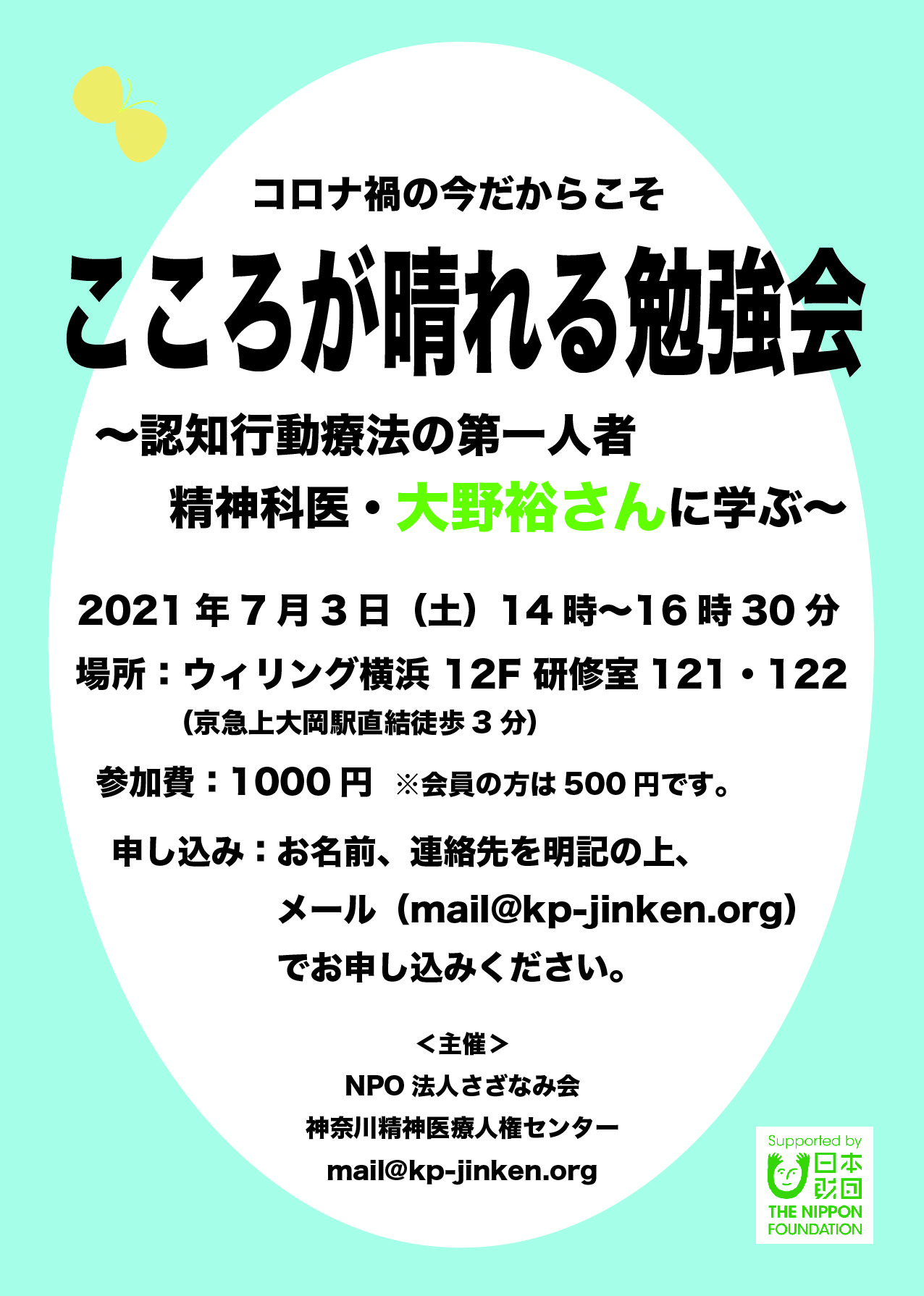 2021年度「心が晴れる勉強会」(大野裕氏講演会)チラシ