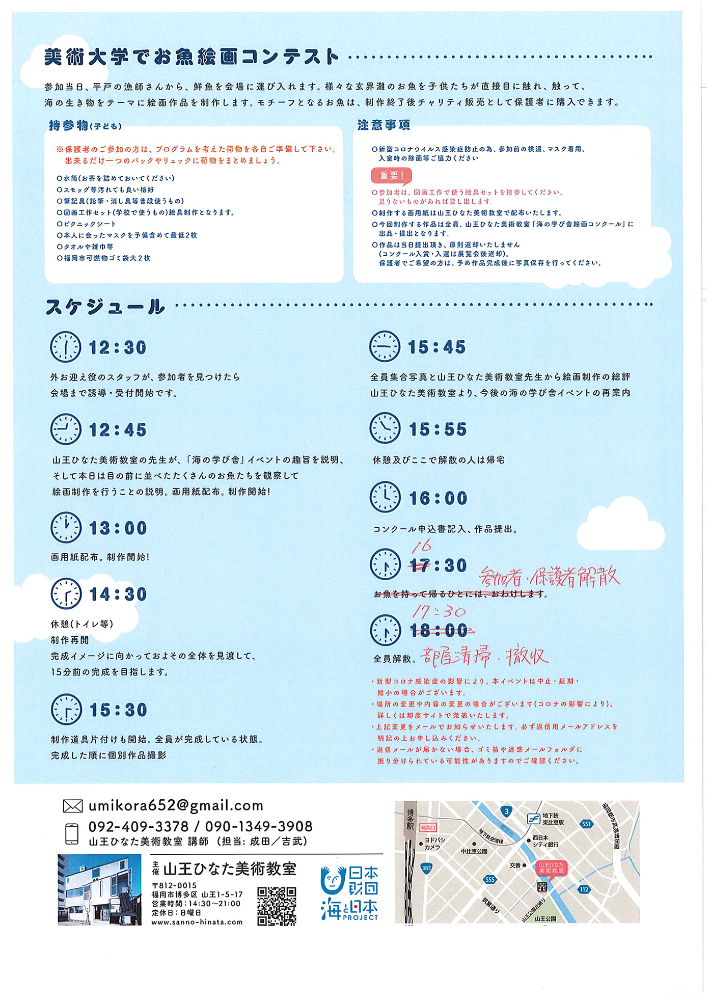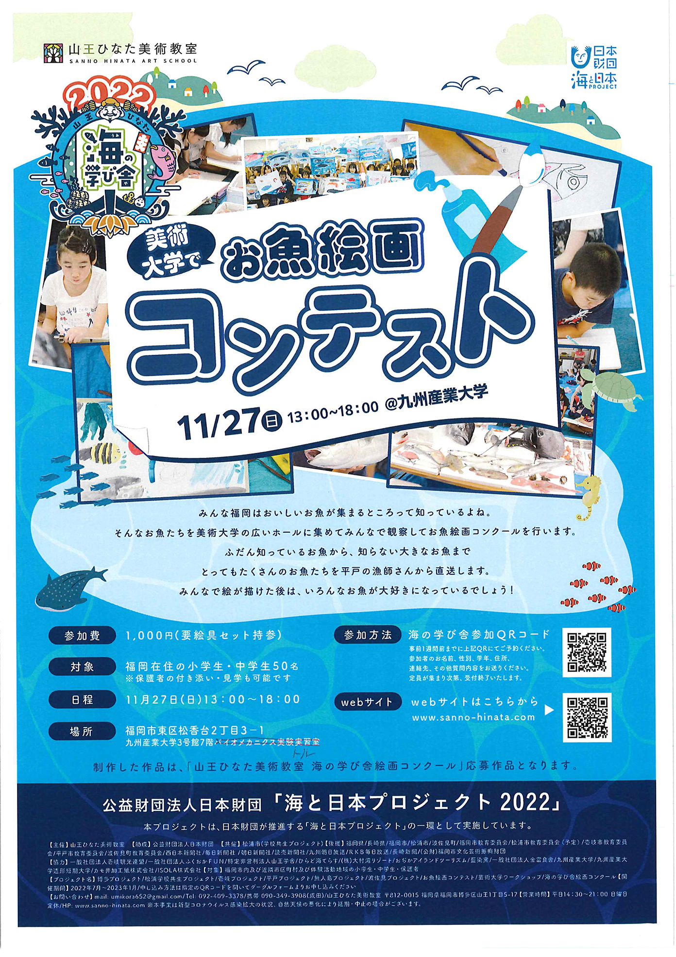 2022年度に実施した海の学び舎(海と日本2022)内の体験イベント「お魚絵画コンテスト」リーフレット。A4サイズデータにて表面と裏面の体験事業案内。