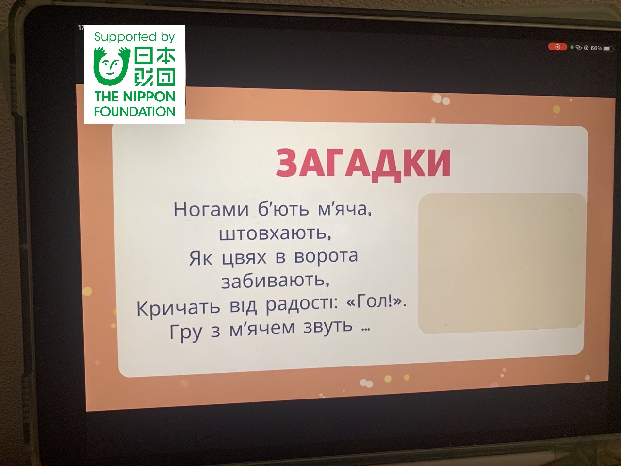 このテキストはシュマク氏とハルチュク氏が作成し、ウクライナ人が好む趣味や、地理について記述されている。 学力向上を図り、参加者全員に宿題を提出するものとする。 幼い子供でもわかりやすく学べるように、画像や絵などを取り入れた内容になっている。 |