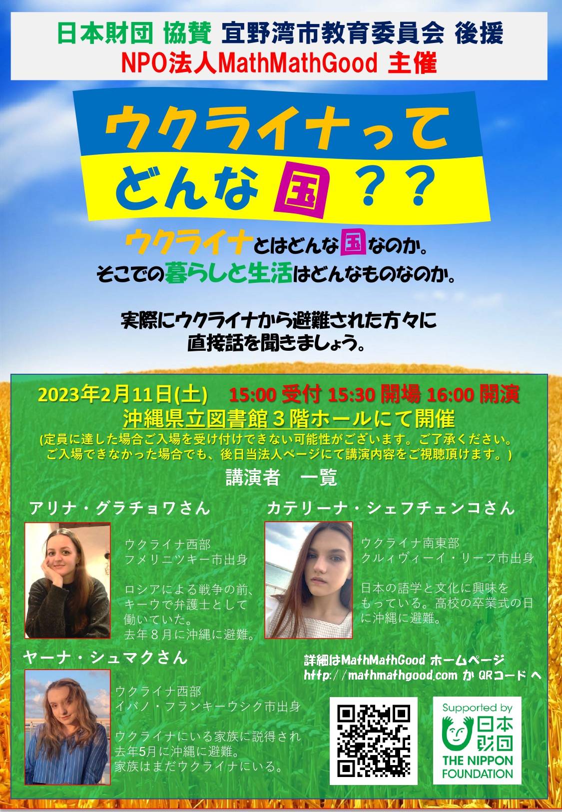 2023年2月11日16:00~18:00に沖縄県立図書館3階ホールにて ウクライナからの避難民による講演会を開催。 ウクライナの文化や地理、偉人、歴史などを紹介し、戦況や現地の状況について話した。 |