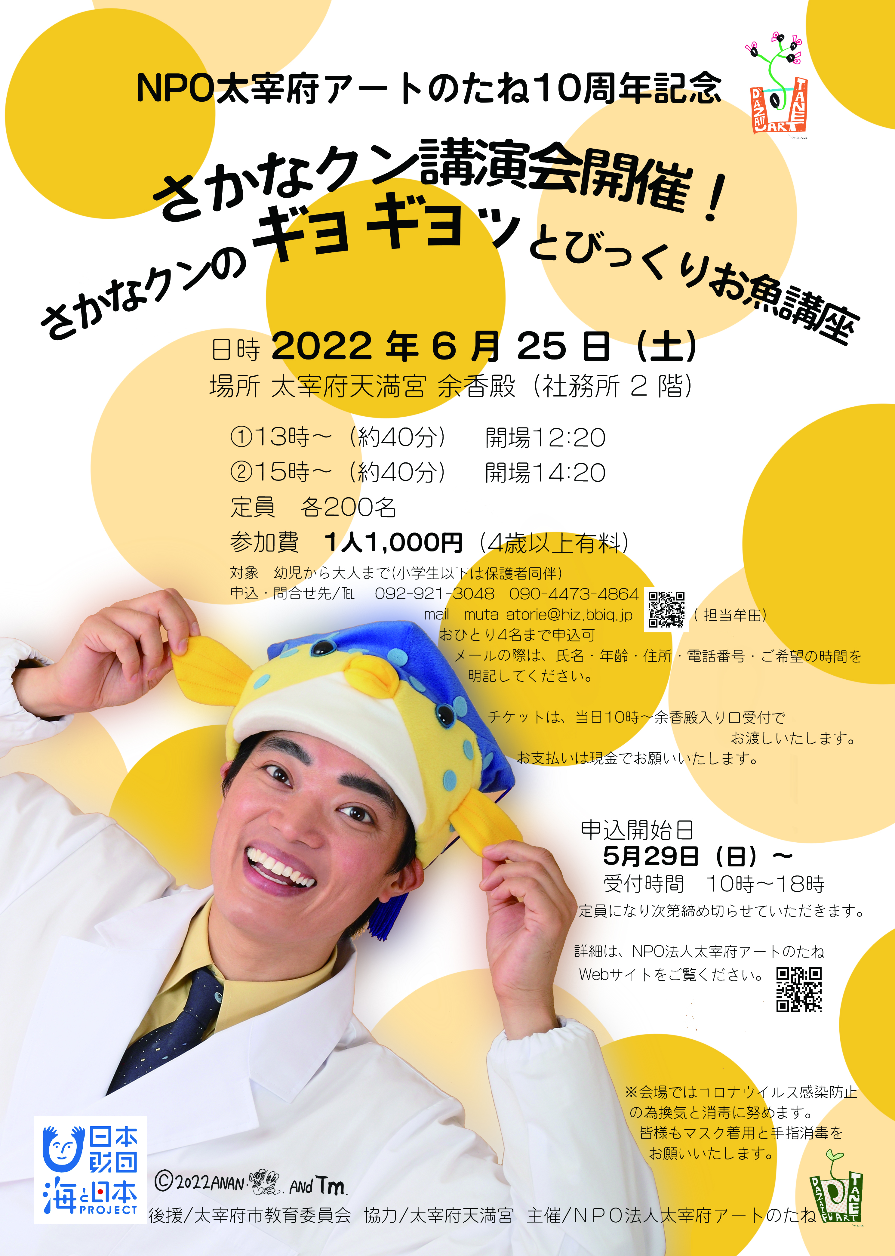a.海洋を表現したダンスパフォーマンス (1)時期:2022年10月1日(土)~2日(日) (2)場所:太宰府天満宮 (3)参加者:約200名×4回 合計約800名 (4)内容:海の中や海の生き物を表現するダンスパフォーマンス wonderwater&Rinnne b.海の未来を考えるワークショップ 日比野克彦ワークショップ ミニこよみのよぶね (1)時期:2022年10月22日(土) (2)場所:太宰府天満宮 (3)参加者:25名 (4)内容:日比野克彦ワークショップ ミニこよみのよぶね c.海洋生物を制作する講座 (1)時期:2022年10月1日(土)~2日(日) (2)場所:太宰府天満宮 (3)参加者:50名×2回 100名 (4)内容:ひびのこづえワークショップ 小さな生きもの研究所 海の生きものをつくろう d.海と水をめぐる環境講座 さかなクンギョギョっとびっくりお魚講座 (1)時期:2022年6月25日(土) (2)場所:太宰府天満宮 (3)参加者:250名×2回 500名 (4)内容:さかなクンが海の現状や魚の生態などについて講義。海のごみを減らすためにみんなにできることを約束。 e.瀬戸内国際芸術祭体験プログラム (1)時期:2022年10月29日~30日 (2)場所:瀬戸内国際芸術祭(香川県直島・粟島) (3)参加者:25名 (4)内容:瀬戸内国際芸術祭2022が開催されている香川県直島・粟島を訪問。地中美術館をはじめ日比野克彦プロジェクトなど多数の現代アートを体験。 海洋を表現したダンスパフォーマンス 太宰府天満宮境内・参道・絵馬堂を使い、2組のダンスユニットがひびのこづえデザインのコスチュームをまとい、海の中や海の生き物を表現するダンスパフォーマンス wonderwater&Rinnne b.海の未来を考えるワークショップ 日比野克彦ワークショップ ミニこよみのよぶね 現代アーティスト日比野克彦氏とともに自分の暮らしがどれほど海の環境につながっているか、海について何を知っているかを考え、各自自分の思いを乗せた船をつくり、夕刻太宰府天満宮の池に浮かべた。 c.海洋生物を制作する講座 ひびのこづえワークショップ 小さな生きもの研究所 海の生きものをつくろう コスチュームアーティストひびのこづえ氏がテレビや舞台の衣装制作に使用した布を使い、海の生き物をイメージしたブローチを制作。 d.海と水をめぐる環境講座 さかなクンが海の現状や魚の生態などについてわかりやすく講義。海のごみを減らすためにみんなにできることを約束。 e.瀬戸内国際芸術祭体験プログラム 内容:瀬戸内国際芸術祭2022が開催されている香川県直島・粟島を訪問。地中美術館をはじめ日比野克彦プロジェクトなど多数の現代アートを体験。 |