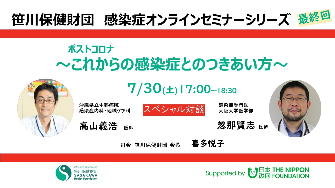 在宅/訪問看護を担う看護師・看護学生、医師、介護関係者他、在宅看護センター、ホスピスナース・ドクターネットワークメンバーを含む保健・医療関係者を対象に実施。 2022年7月30日(土)17:00~18:30 テーマ:ポストコロナ~これからの感染症とのつきあい方~ 講師:高山義浩先生 沖縄県立中部病院感染症内科 忽那賢志先生 大阪大学医学部感染制御学講座 教授 喜多悦子 当財団会長(司会) 参加者:168名 |