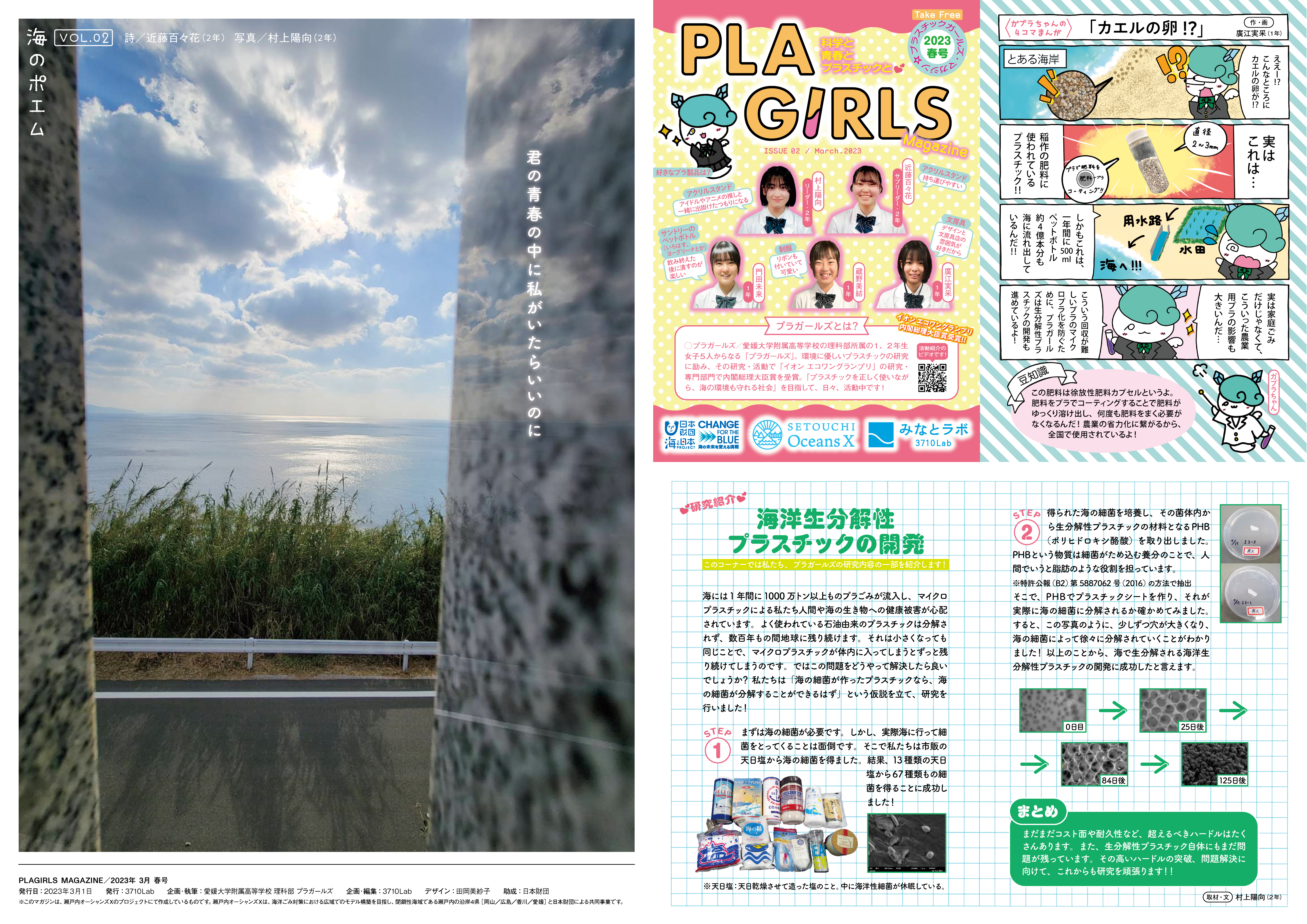 愛媛大学附属高等学校の理科部の「プラガールズ」は、環境にやさししプラスチックの研究に励んでいます。その研究・活動を多くの人に知ってもらうための冊子。瀬戸内オーシャンズXのプロジェクトにて作成しているものです。