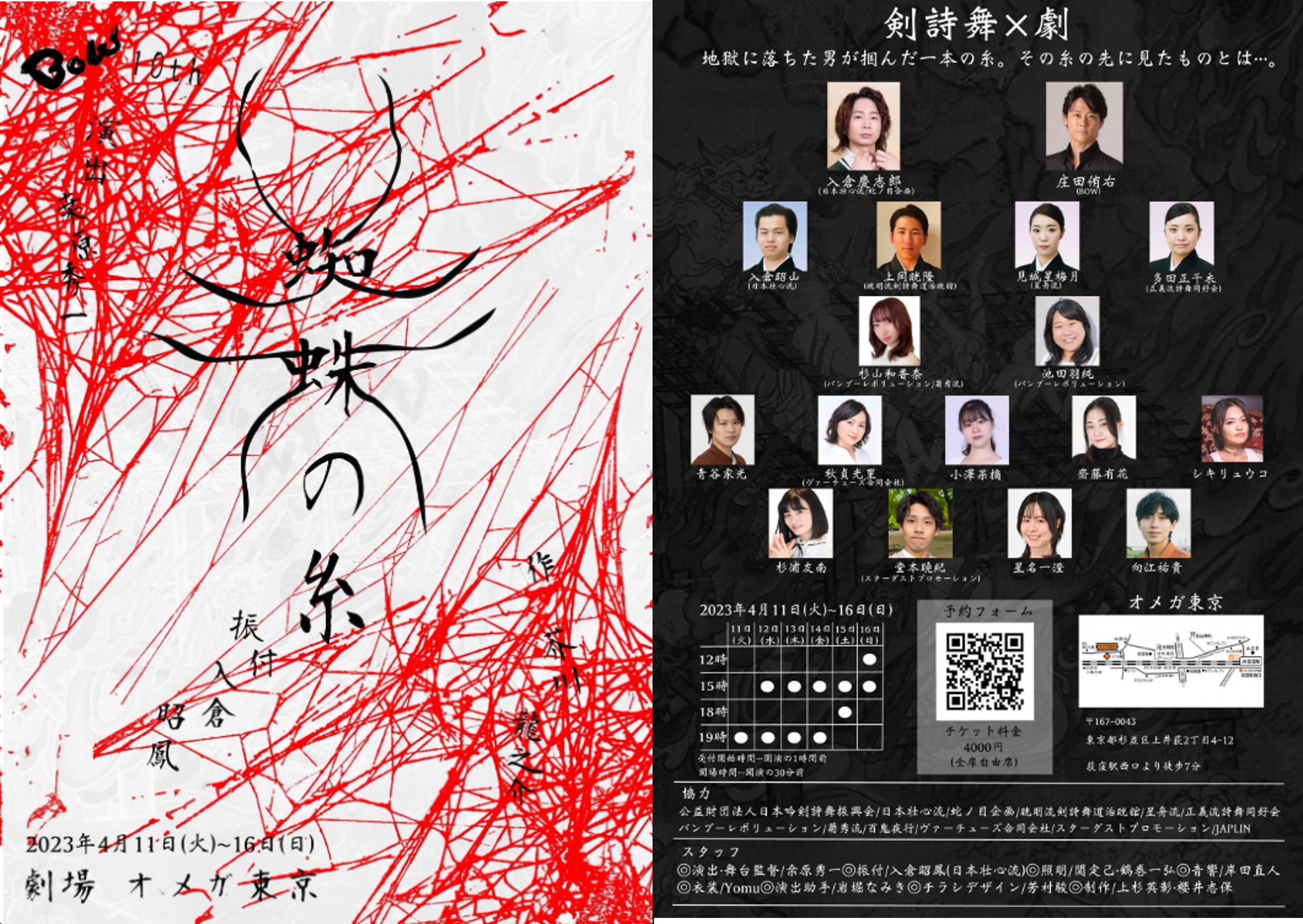 吟詠・剣詩舞スーパーチームの技術向上のため、支援をを行った 「全国吟詠剣詩舞道祭みやざき」への出演 「OUR FESTIVAL SHIZUOKA(静岡市中心市街地の施設、ストリート、公園などを舞台にしたパフォーマン ス・フェスティバル)への出演 「蜘蛛の糸」(剣詩舞と演劇をコラボレーションした演劇舞台)の企画案 ・プログラム ・当会発行の月刊誌記事 ・チラシ |