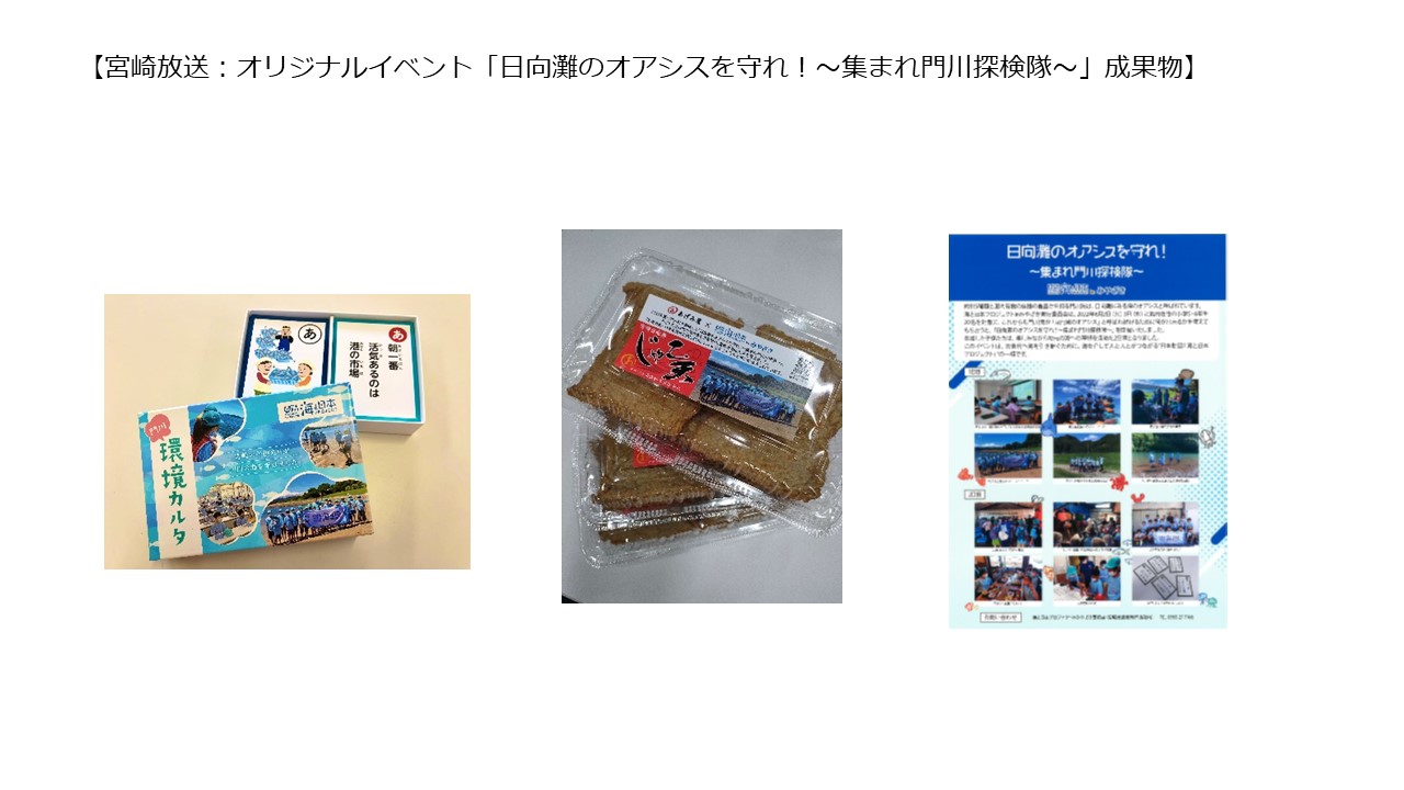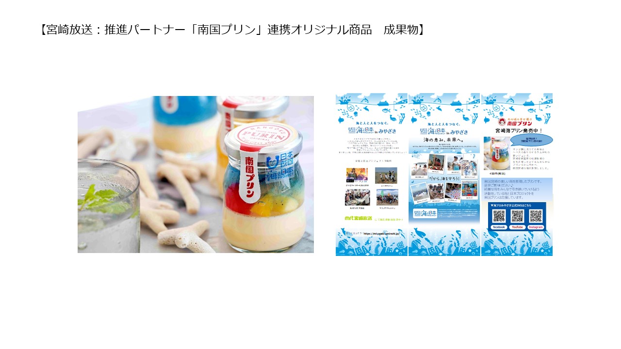 ②プロジェクト訴求映像の制作・編集3本(各15秒) ③公式ウェブサイトにて、県内の海に関する50の取り組みをニュース記事で発信 ④オリジナルイベント「日向灘のオアシスを守れ!~集まれ門川探検隊~」の子供用のシャツ、帽子、名札のJPG画像 ⑤オリジナルイベント「日向灘のオアシスを守れ!~集まれ門川探検隊~」アウトプット(カルタ、あげみ、ちらし)のJPG画像 ⑥推進パートナー(「南国プリン」)連携オリジナル商品のJPG画像 ⑦推進パートナー(「ラディッシュ」)連携オリジナル商品のJPG画像 ⑧推進パートナー(「くいしんぼう」)連携オリジナル商品のJPG画像 |