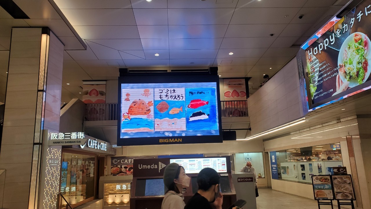 事業成果物概要 海と日本プロジェクトin 大阪実行委員会は、大阪府の小学 5 ・ 6 年生を対象に大阪湾の多様な生物や海洋問題、栽培漁業などを学ぶイベント「大阪湾めっちゃええやんプロジェクト」を 9 月 24 日(土)、 25 日(日)に開催いたしました。小学生たちはこの2 日間で学んだことを大阪湾 PR ポスターとして制作し、大阪の中心に位置する阪急梅田駅の構内のビジョンにて公開されました。 |