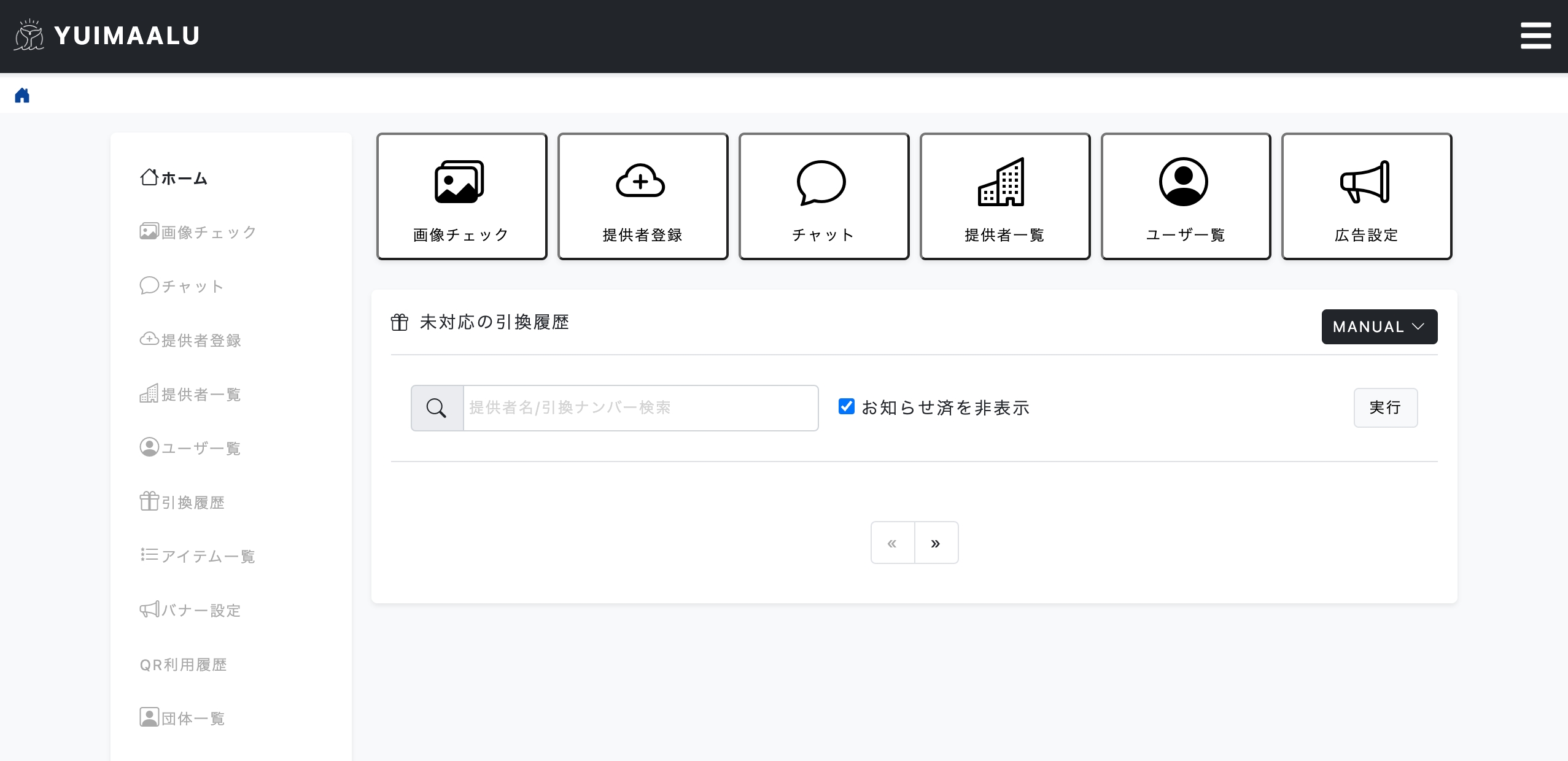 ①YUIMAALU事務局用 ・アプリユーザー管理 ・応援アイテム提供者管理 ・登録清掃団体管理 ・QRコード管理 ・記録画像チェック ・チャット ・アイテム引き換え履歴 ・バナー設定 機能を含む ②応援アイテム提供者様用 ・応援アイテム管理 ・ポイント交換関連 ・チャット ・事業者設定 機能を含む ③登録清掃団体様用 ・イベント登録 ・QRコード発行 ・団体情報管理 機能を含む |