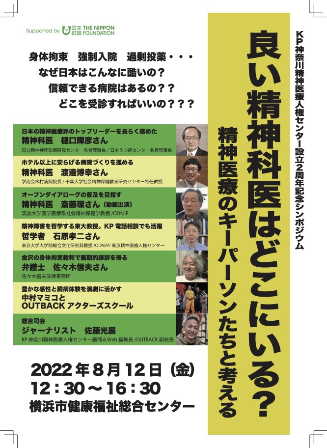 2022年8月12日に行われた、当センター2周年シンポジウムのチラシ。精神科医、大学教授、弁護士のシンポジストをお招きして精神医療のあり方について話し合った。当日は135名が参加した。