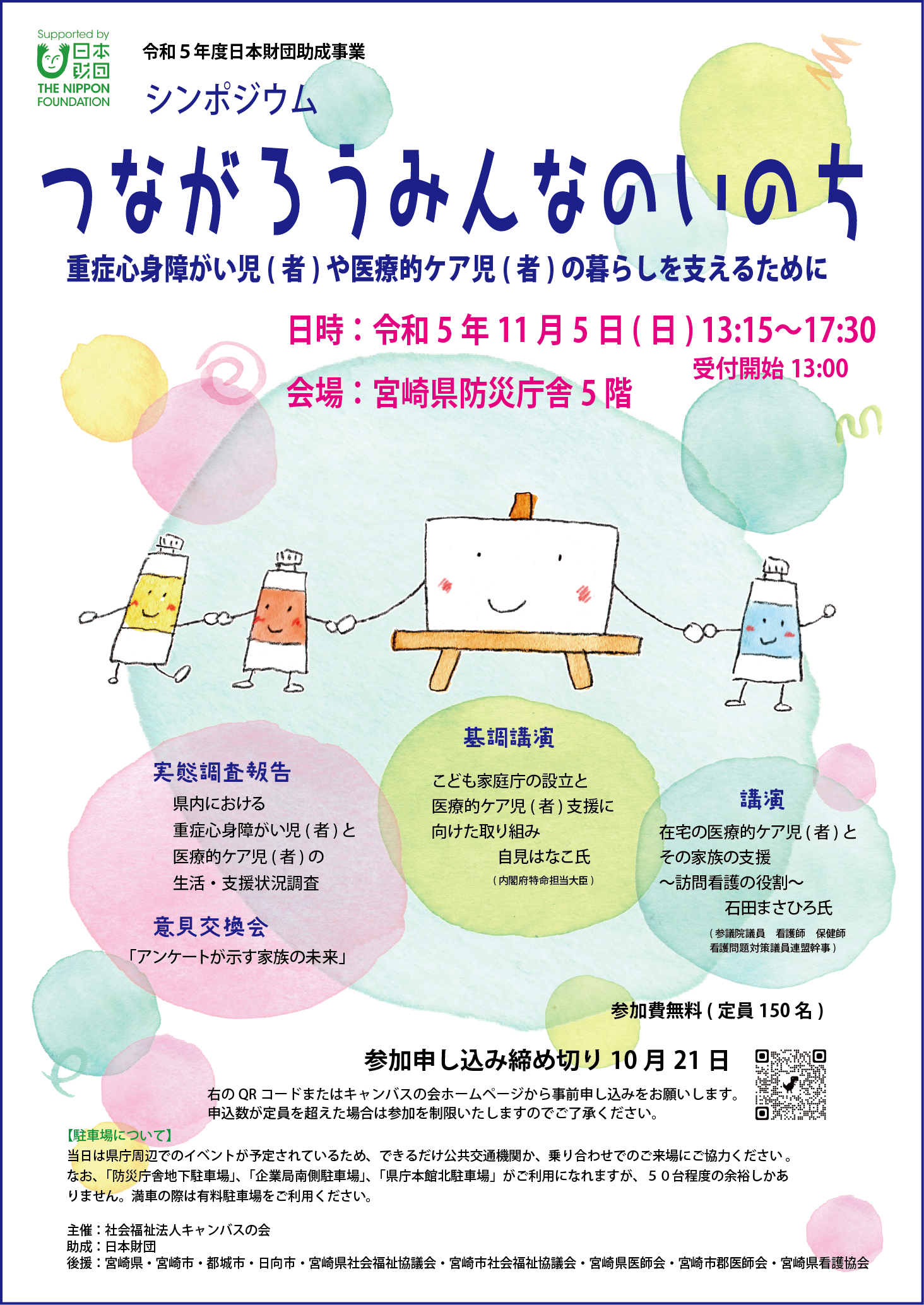 宮崎県において障害福祉ービス事業を展開する本法人では宮崎県の協力をいただき、県内の重症心身障がい児(者)や医療的ケア児(者)とその家族の生活及び支援の状況並びにそれに対する福祉サービスの現況についての実態調査を行った。当事者家族、市町村の担当窓口、医療的ケア等コーディネーター、訪問看護ステーションを対象に、日常生活を送る上で特に負担の大きい、入浴・移動・日中の居場所という3つの生活場面におけるサービスの状況について焦点を当てたアンケート調査を実施した。【事業1】 このアンケート調査の分析結果をもとに、宮崎における当事者とその家族の暮らしを支えるために出来る事を、当事者とその家族、各関係機関、一般の方々と共に考えるシンポジウム「つながろうみんなのいのち」を開催した。【事業2】 〇【事業1】 支援サービス格差の実態調査 (1)時期:2023年5月~10月 (2)内容:①実態調査委員会の設置。 ②地域差把握のためのアンケート調査の実施 対象:重症心身障がい児者と医療的ケア児者家族(320)市町村担当(26) 医療的ケア児等コーディネーター(15)訪問看護ステーション(147) 〇【事業2】 シンポジウム「つながろうみんなのいのち」 ~重症心身障がい児(者)や医療的ケア児(者)の暮らしを支えるために~ (1)時期:2023年11月5日(日) (2)場所:宮崎県防災庁舎 (3)参加者:124名(県・市町村担当、関連団体、医療的ケア児者等) (4)内容: 第一部 県内における実態調査アンケートに基づく生活支援状況の報告、会場参加者との意見交換 第二部 基調講演「こども家庭庁の設立と医療的ケア児者支援に向けた取り組み」 内閣府特命担当大臣 自見はなこ 講演「在宅の医療的ケア児者とその家族の支援~訪問看護の役割~」 参議院議員 石田まさひろ |