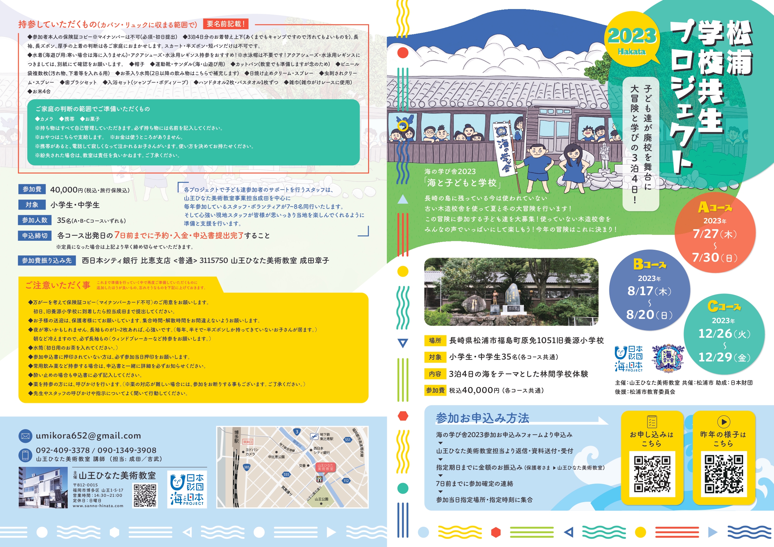 2023年度に事業実施した「海の学び舎(海と日本PROJECT2023)」内におけるフィールドワーク「松浦学校共生プロジェクト」の事業案内パンフレット。AコースBコースCコースの3日程があり、A3サイズ裏表面に事業内容や日程、参加費用などを詳述。2つ折り印刷にて20000部印刷を行い、事業案内地域の福岡県内各所及び長崎県松浦市の小学校配布を行った。