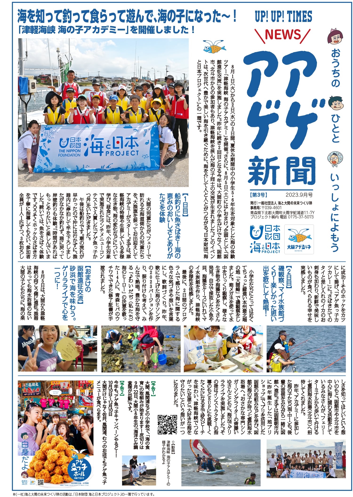 ・アゲアゲ新聞2号→事業のキックオフとして、首長表敬の実施を伝えたもの ・アゲアゲ新聞3号→「津軽海峡 海の子アカデミー」の実施レポート ・アゲアゲ新聞4号→下北半島の11小中学校と連携した「海の食育」の実施レポート |