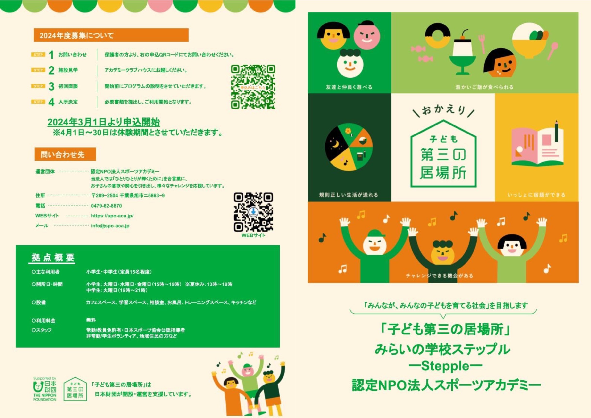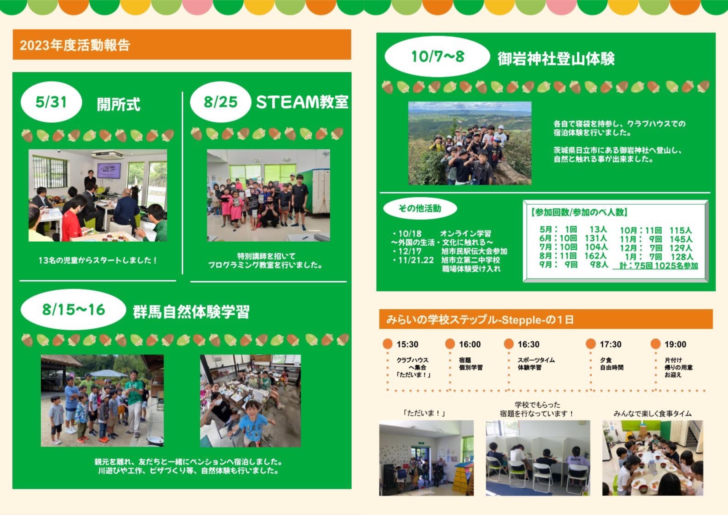 5/31 開所式 8/15・16 群馬自然体験学習 8/25 STEAM教室 10/7・8 御岩神社登山体験 10/18 オンライン学習~外国の生活・文化に触れる~ 12/17 旭市民駅伝大会 ・みらいの学校ステップルーSteppleーの一日 ・2024年度募集について ・問い合わせ先 ※旭市内の小学生全員へ学校を通して配布しました |