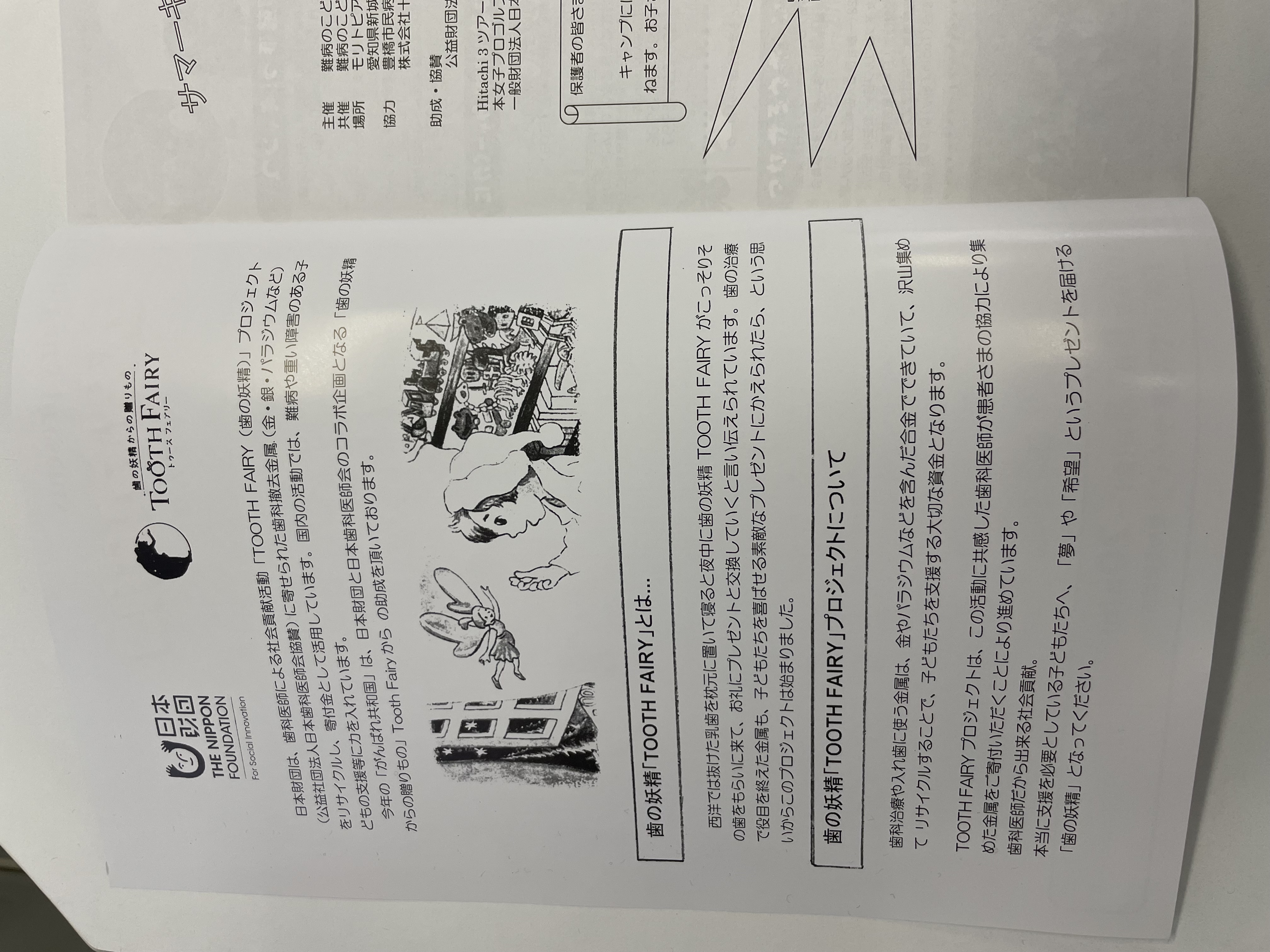 目次(の一例) 表紙 日本財団・日本歯科医師会「Tooth Fairy」からの助成であることを示すページ 開催の要項 サマーキャンプ“がんばれ共和国”について ホテル館内図 キャンプのスケジュール 参加者へのご案内と注意事項 備忘録 旅行保険の案内 お友だちをつくろう(連絡先記載欄) 難病のこども支援全国ネットワークの活動案内と会員制度について ホテルへの案内地図 裏表紙(「Tooth Fairy」のロゴ) |
