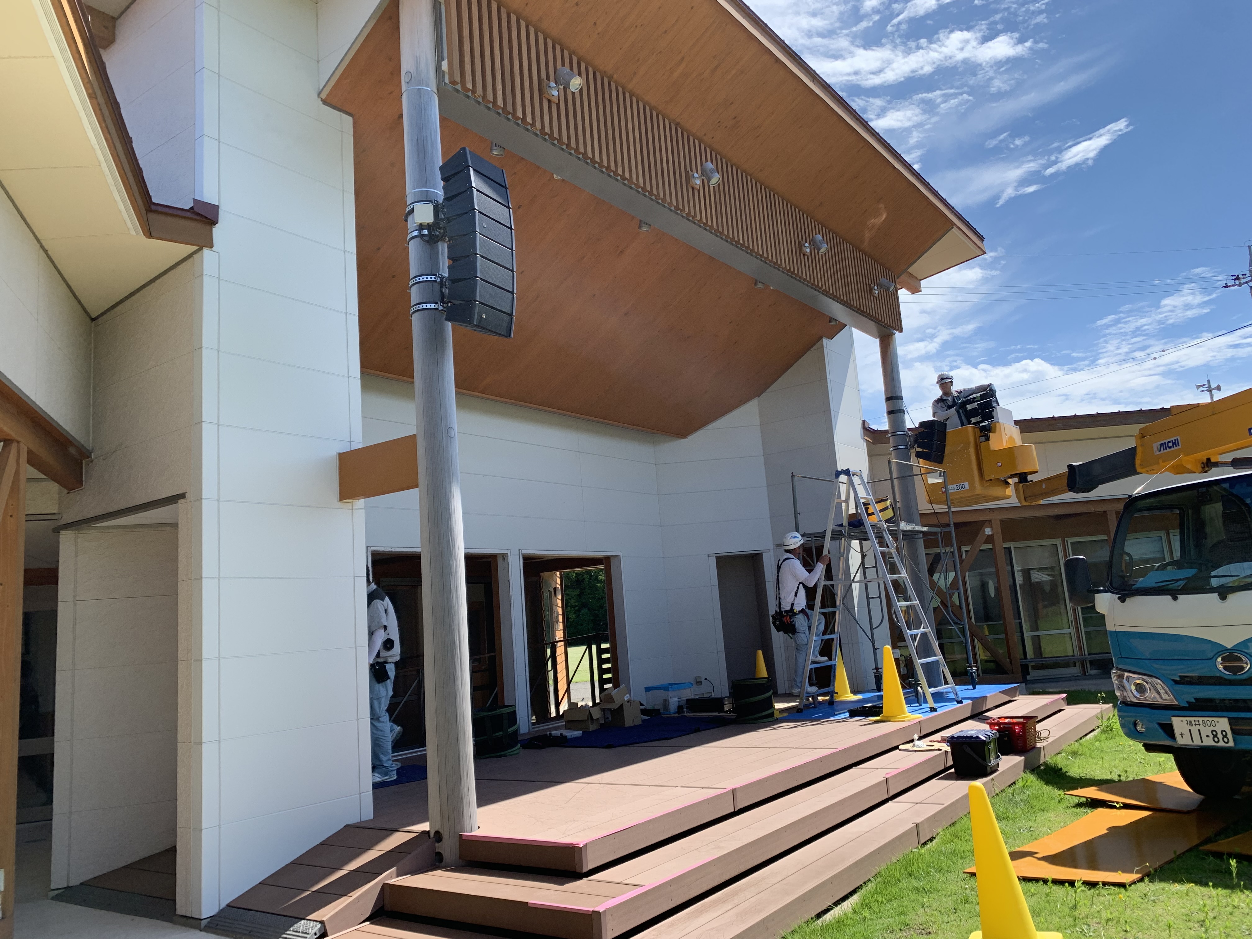 【詳細】 ①パワ-アンプ500W クラス×3台 ②コンパクトアレイスピ-カ-×4台 ③サブウ-ハ-×2台 ④取り付け材料費・取り付け工事費 等 合計 2,090,000円 |