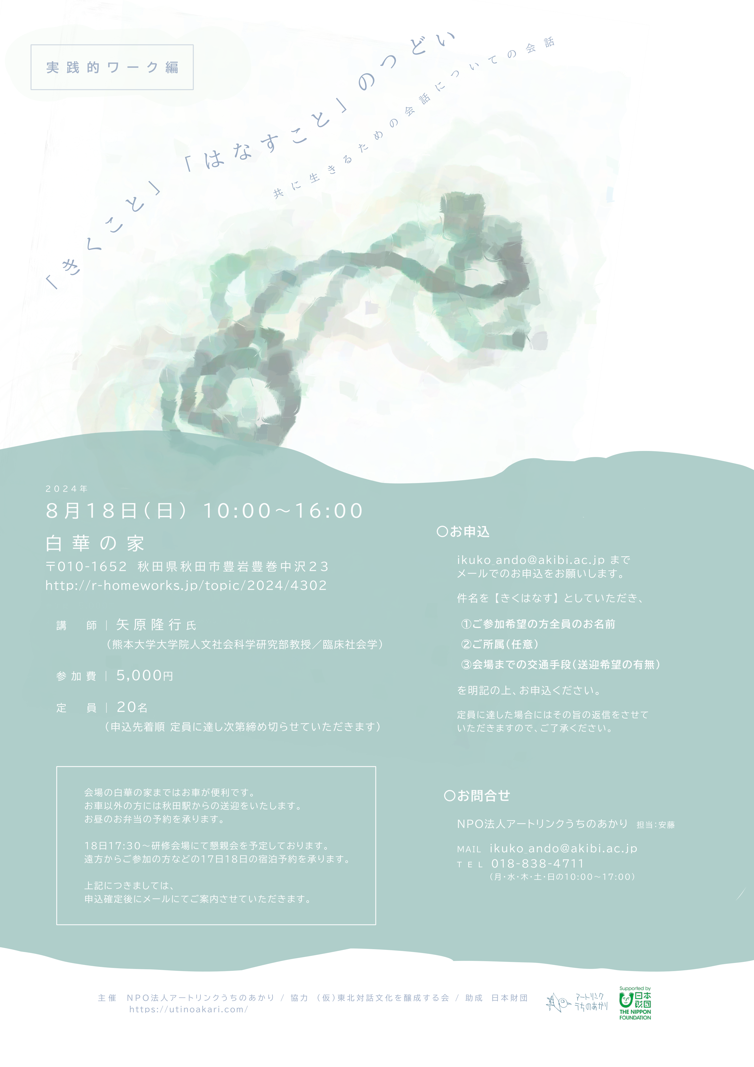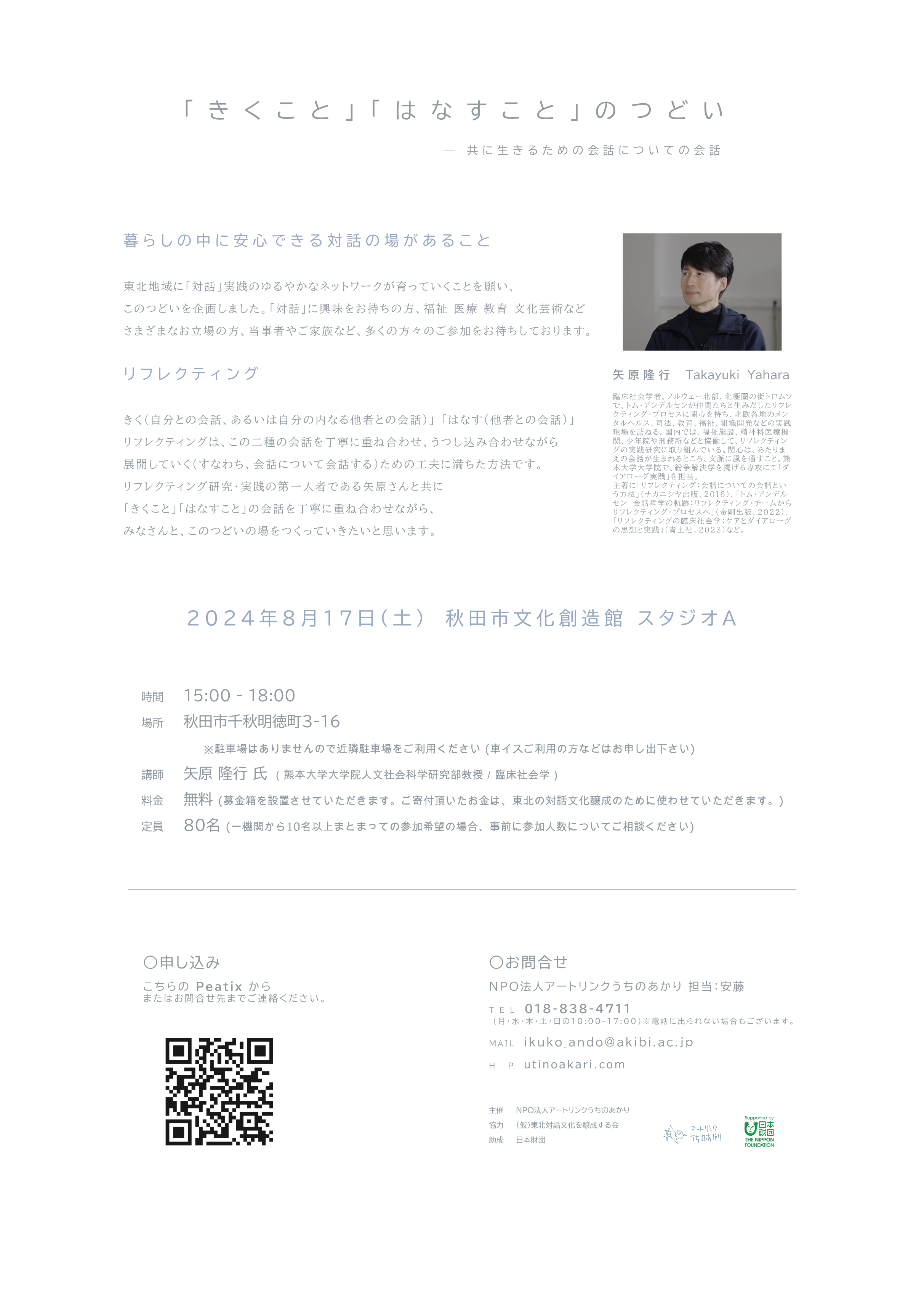 2. きくこと はなすことのつどい チラシ表面 3. きくこと はなすことのつどい チラシ裏面 4. きくこと はなすことのつどい研修 チラシ 5. 事業報告書 たきびっこ 2023年 6. 事業報告書 たきびっこ2024年 7. 事業内容1 居場所を仲間たちの手で改修する 8. 事業内容2 アートと対話を媒介とした場 |