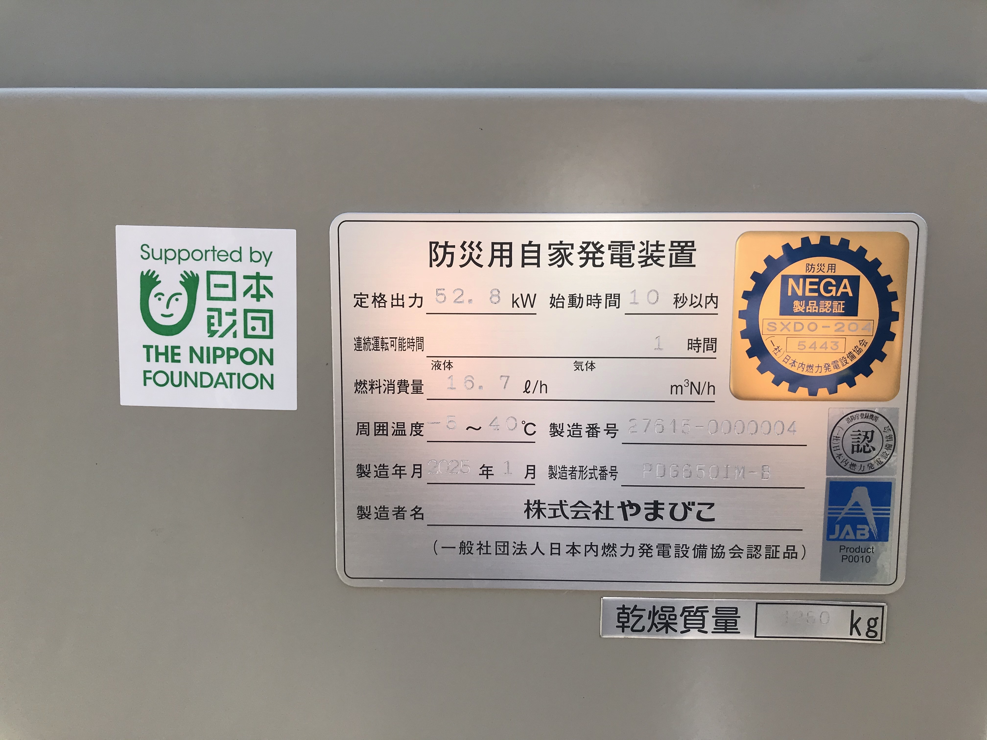 2.機器内容:発電機1台(65,000VA) 3.施設名称:介護老人保健施設レイクヴィラたぎり 4.整備場所:福岡県田川郡糸田町字木実浦870-3 5.定員:120名 |