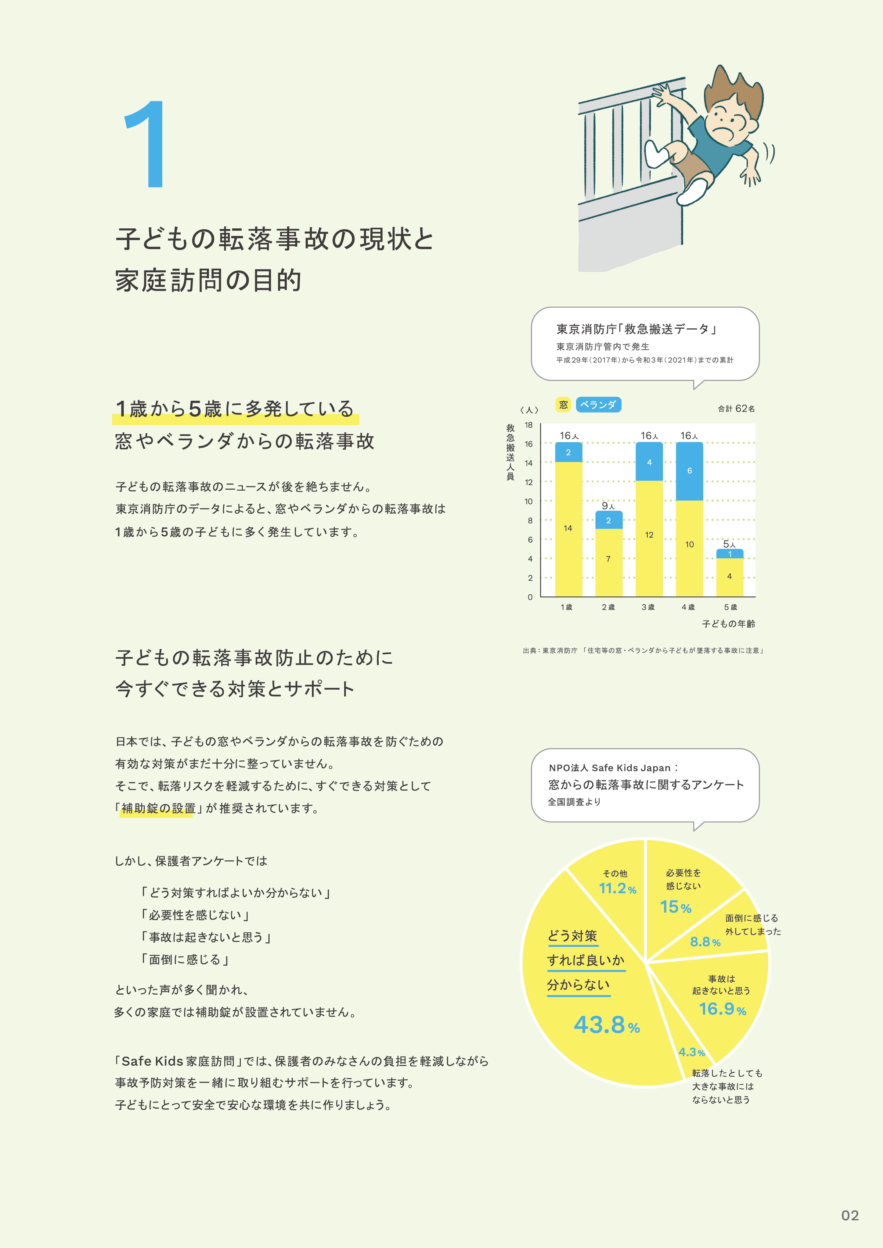 しかし、実際には、適切にメッセージが伝わっていなかったり、補助錠を選んで設置するまでの手間などの理由から、ほとんどの家庭は設置していないのが現状です。 この問題を解決するために、子どもの窓・ベランダからの転落予防のための家庭訪問マニュアル「Safe Kids家庭訪問」を作成しました。 保護者の皆さんの負担を軽減しながら、事故予防について一緒に取り組むためのサポートマニュアルです。 |