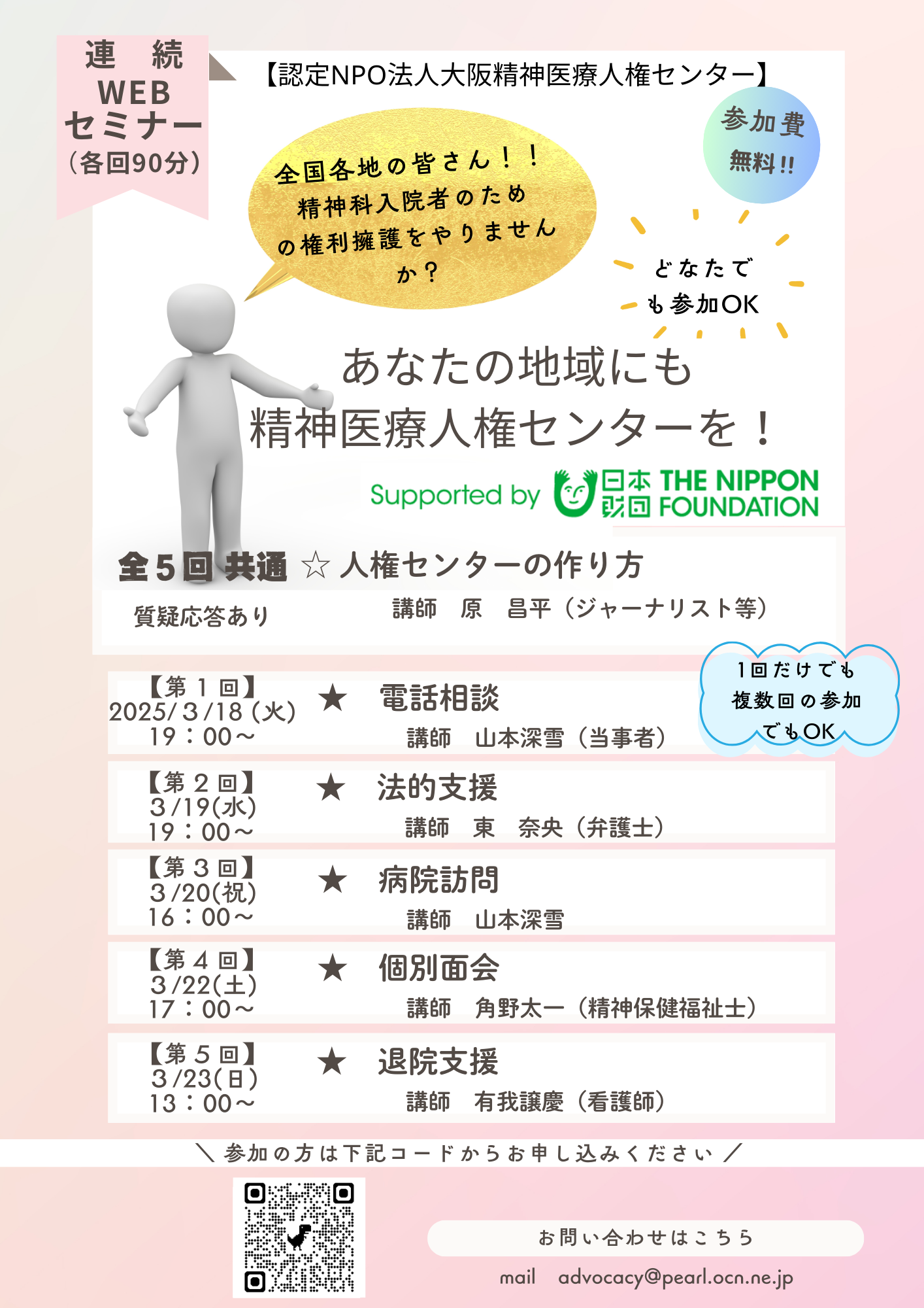 精神科アドボケイト拠点立上げ支援(千葉・愛知・奈良)研修、連続WEBセミナーチラシ