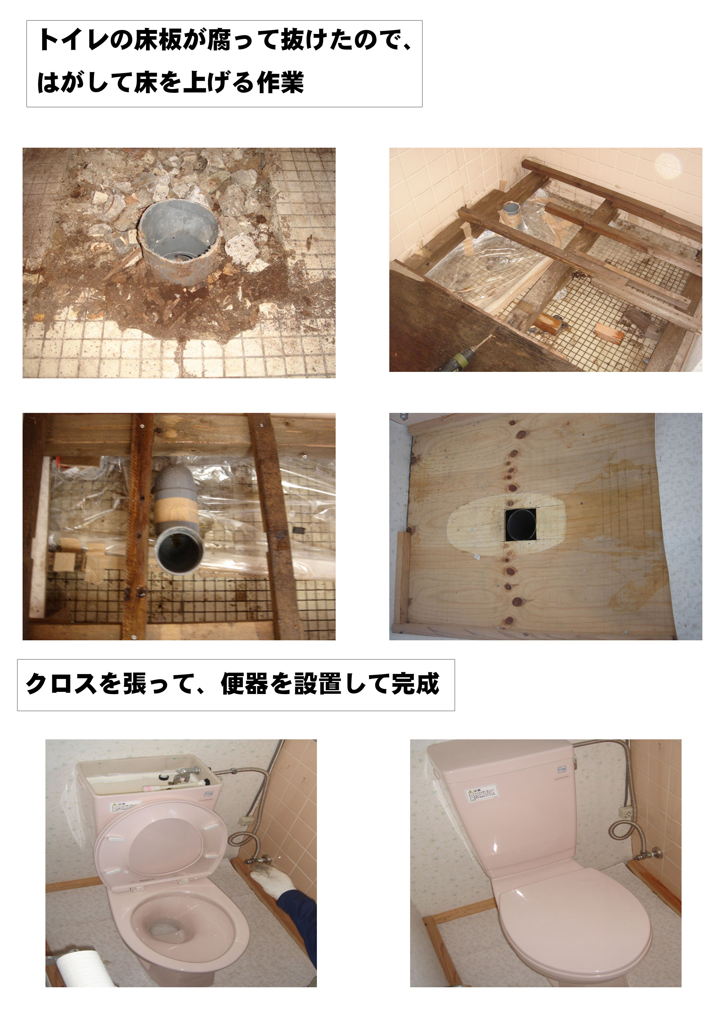 改装による児童ふれあい学館の整備 2.事業内容 「南総ふれあい学館」のトイレ・浴室の修繕 整備場所 千葉県市原市古敷谷2263-1 面積 敷地 1877.02㎡ 延床 346.30㎡ 構造 木造平屋建て亜鉛鉄板葺き 施設概要 実習教室2室、遊戯室、事務室、厨房、トイレ、浴室、グランド等 定員 40名 物件過去 旧市原市立富山保育所(築30年) 所有形態 市原市より賃貸借 3.トイレの修繕工事の写真です |