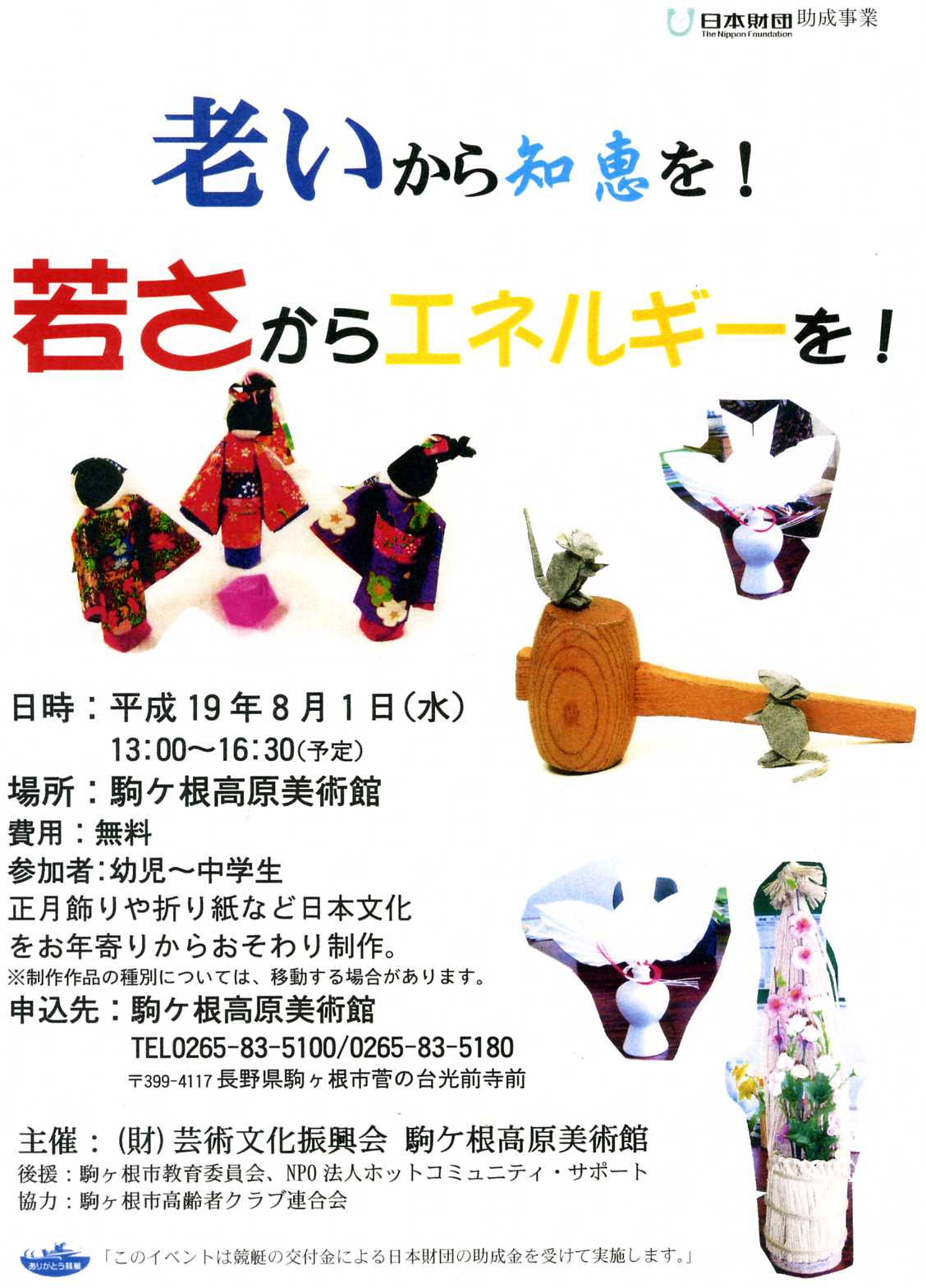 創作活動を通じた子どもたちと高齢者の交流 「老いから知恵を!若さからエネルギーを!」 2、目的 モノを創ること=芸術の中にある知識、感性を次世代に継承しつつ、互いに作品を制作、展示発表することで感性の交流の機会とする。 また、共通のテーマを題材にすることにより、地域の文化への関心と理解を生み、ふれあいから高齢者を敬う心をはぐくみ「生きる力」をはぐくむことを目的とする。 3、内容 日本の伝統行事である正月の飾りや、紙人形などを高齢者の指導の下、幼児から大人までは制作。その後、完成作品に加え、中学生、高齢者の作品を同展示室で展示することで芸術を通しての交流も行った。 |