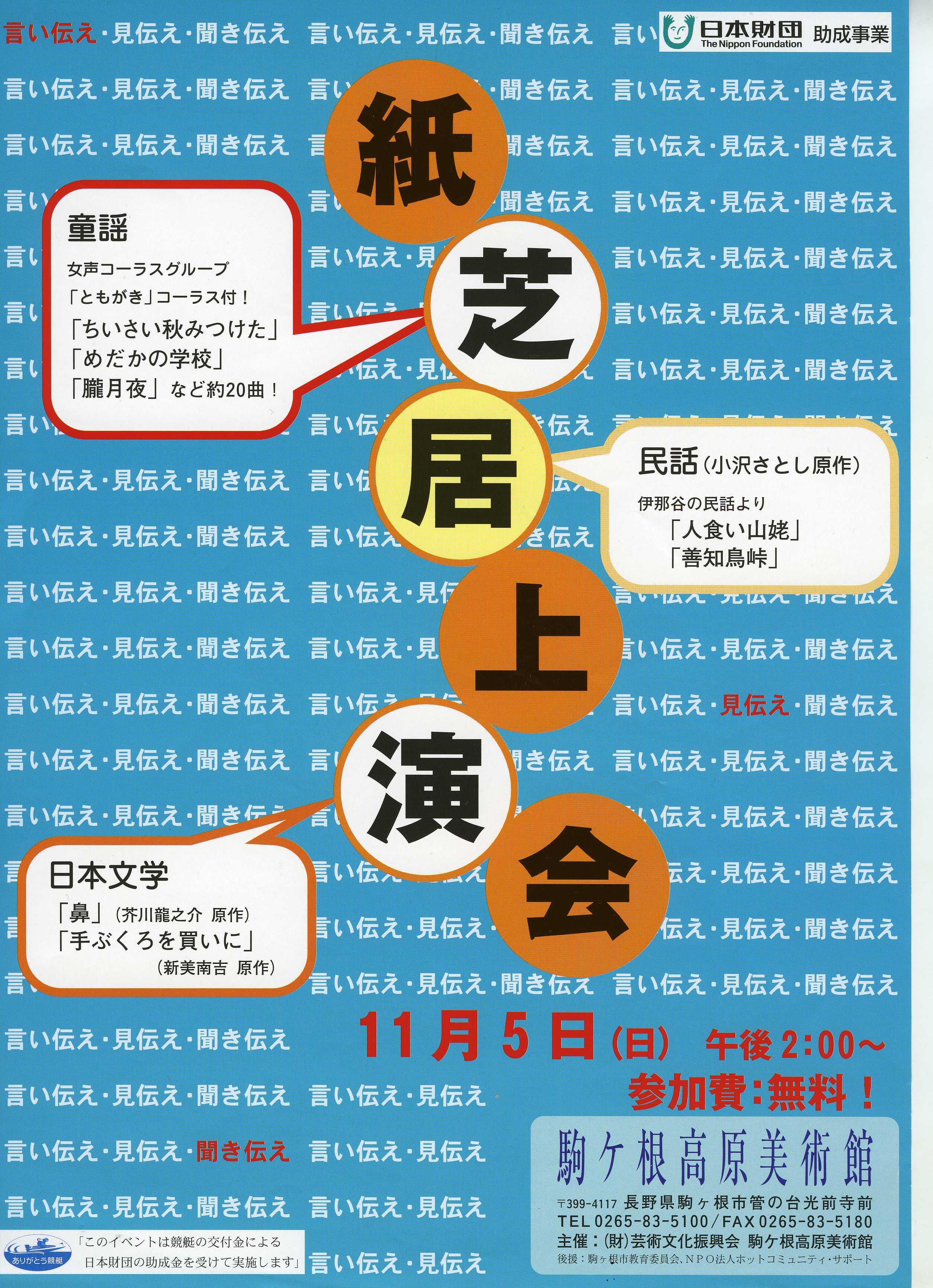 1、事業名 紙芝居の伝承と発展 2、目的 昨年からの継続事業とし、「ことば」を表現する「紙芝居」を題材に、俳句や日本文学、童謡など「美しい日本語」を用い、小中学生が中心に制作、地域の読み手による発表から美しい日本語、日本文化を言い伝え、見伝え、聞き伝え、をもって伝承していく。 3、内容 民話、童謡、俳句などを題材に地域の小中学生がプロの作家の指導のもと紙芝居を制作。 完成作品は地域の語り手、制作者によって上演。 またその後、紙芝居の貸し出しを行った。 |