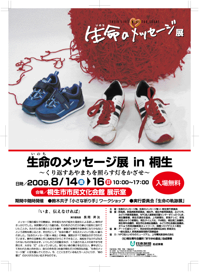 8月14日~16日まで、群馬県桐生市の市民文化会館にて開催されるメッセージ展のチラシ画像です。