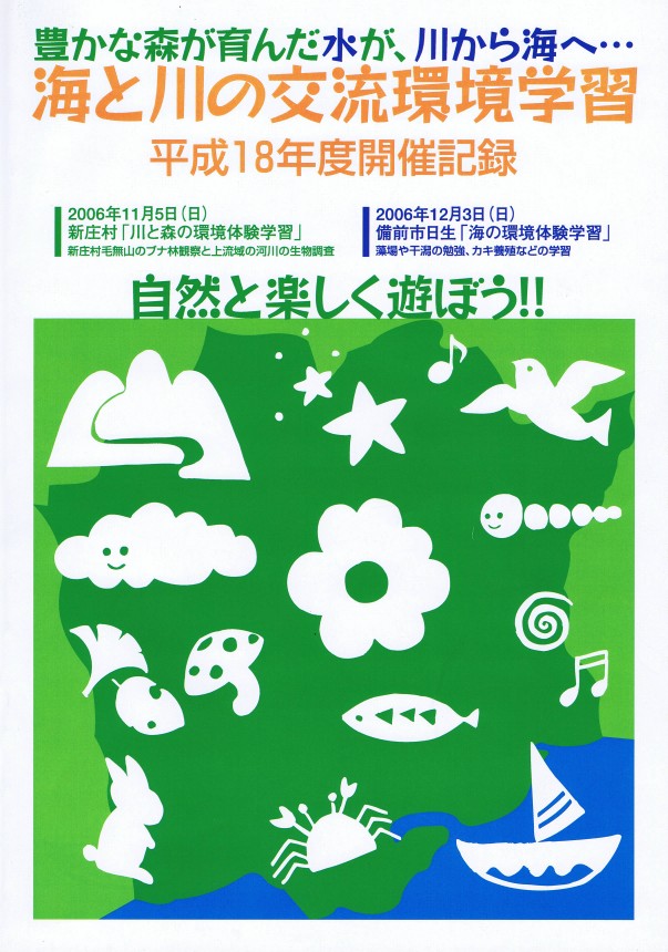 ※2006年11月5日(日) 新庄村「川と森の環境体験学習」 新庄村毛無山のブナ林観察と上流域の河川の生物調査 ※2006年12月3日(日) 備前市日生「海の環境体験学習」 藻場や干潟の勉強、カキ養殖などの学習 |