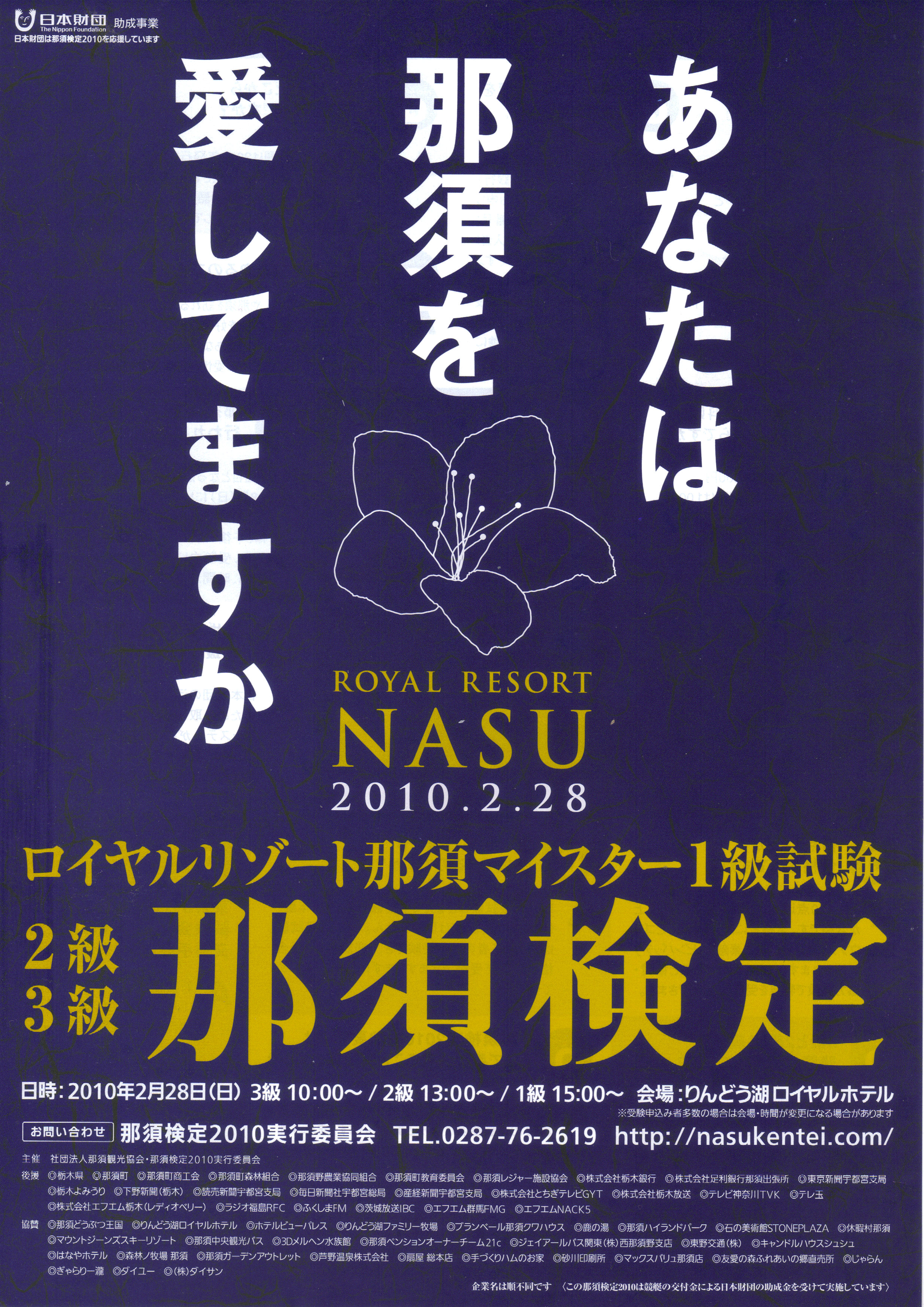 ROYAL RESORT NASU 那須検定2010 開催実施要項(案) ◎試験日時 : 2010年2月28日(日曜日) *時間は未定 ◎試験会場 : りんどう湖ロイヤルホテル ◎受験定員 : 3級/2級 1級=47名 ◎受験資格 : 3級=年齢、性別、学歴、国籍はいっさい問わず 2級=那須検定2008/2009の3級合格者に限る 1級=那須検定2009の2級合格者に限る ◎受 験 料 : 3級 大人=1,800円(税込) 高校生以下=1,000円(税込) 2級 大人=2,000円(税込) 高校生以下=1,200円(税込) 1級 (未定) *10人以上で申し込みの方には特別割引料金を用意 ◎出 題 : 3級/2級=那須検定公式テキストブックⅡから 1級=那須検定出版本(2009年10月発売予定)から |