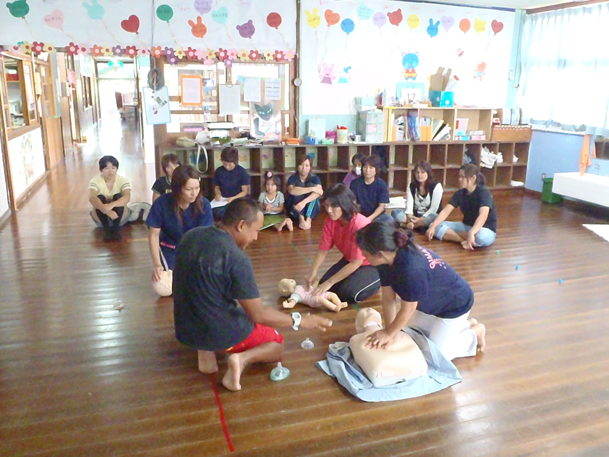 14時30分から17時30分まで儀間保育園にて、1次救命の勉強会を行いました。今回は、保育園ということもあり乳児や小児を対象にしたAED&CPRが中心になります。 総勢13名がお集まり頂きました。 |