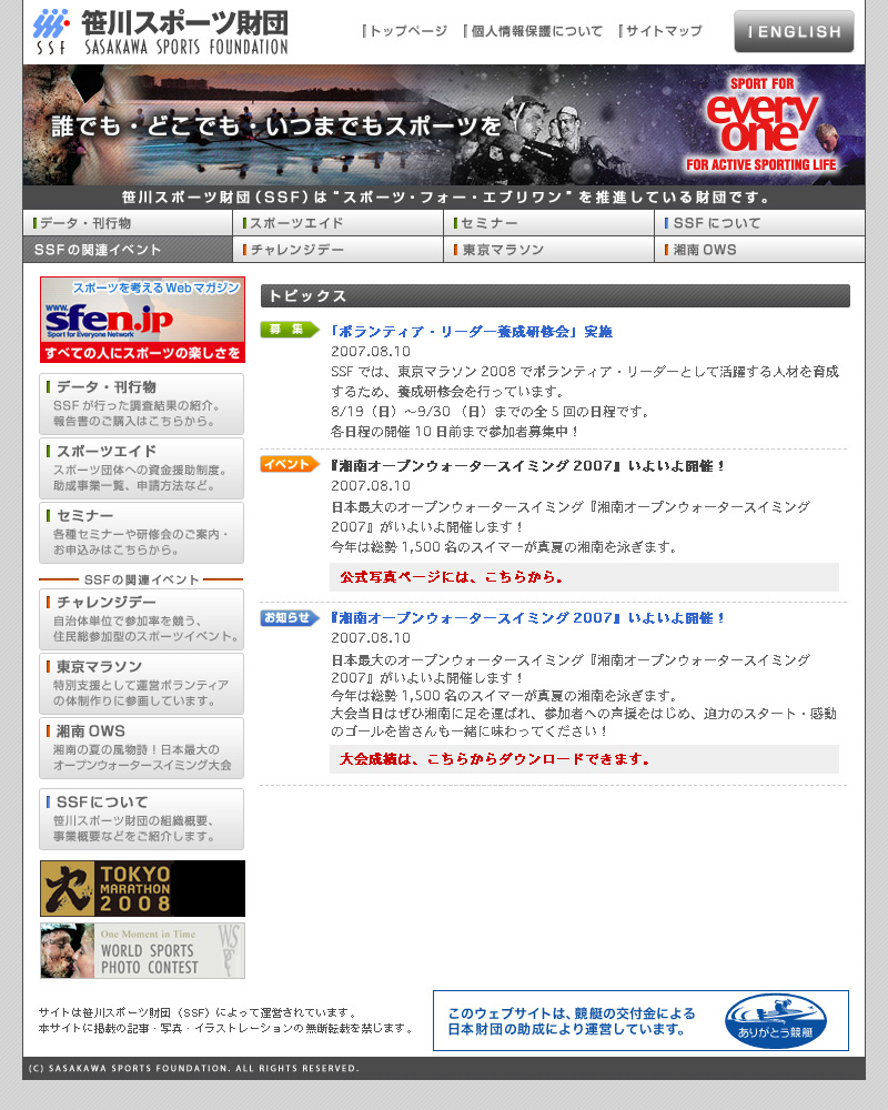 生涯スポーツ等の情報拠点整備 「インターネット総合スポーツサイト等の運営」 2.目的 本事業は、インターネットや刊行物等を通じ、全国のスポーツ振興関係者ならびにスポーツ愛好者に対し、国内外の最新のスポーツ情報を迅速かつ効果的に提供することによって、スポーツ・フォー・エブリワンの推進に寄与する。また、その推進機関である当財団の活動をより多くの方々に知ってもらうために、広報ミーティングを開催し、周知・広報活動を行う。 3.内容 当財団の全般と当財団の事業内容を広く周知しするために、財団公式サイトの充実を図った。本サイトでは当財団の情報開示(役員・決算・報告等)、事業の紹介等主にを行ない、団体の認知度アップに努めた。 (他にスポーツ情報サイトsfenもあるが一線を引いて実施中) 4.成果物 財団公式サイト トップ画面 |