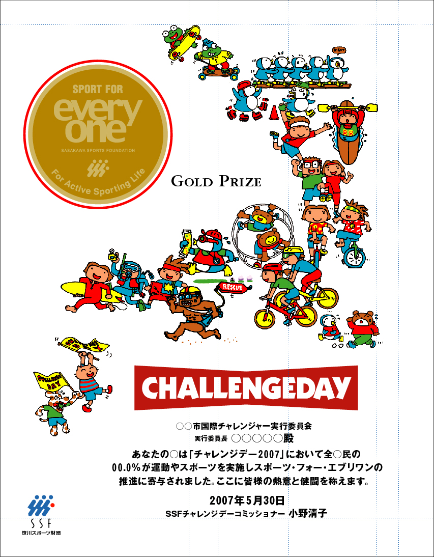 チャレンジデーの実施・普及 2.目的 本事業は、市民ひとりひとりに、運動やスポーツの楽しさ、素晴らしさを感じてもらうとともに、スポーツ参加への意欲を高めるきっかけづくりとして、また、スポーツを通した地域の活性化事業の一環として、全国の自治体に本事業を広く普及することで、わが国のスポーツ・フォー・エブリワンを推進する。 3.内容 2007年5月30日(水)に実施した「チャレンジデー2007」。国内では15回目を数え、目標としていた100自治体の達成には至らなかったものの、全国の自治体・地域から92カ所(16市25町5村46地域)が実施し、参加者数も約87万1千人に及んだ。また、全実施自治体・地域の平均参加率は51.5%と、全実施自治体・地域で数多くの参加があり、まさに日本最大のスポーツイベントと言える結果となった。各実施自治体・地域では、チャレンジデーの実施を単なる一過性のスポーツイベントとしてではなく、「地域住民の健康意識の増大」、「地域の活性化」、「運動・スポーツの習慣化」、「医療費削減」、「自治体合併」等といった各自治体・地域が抱える問題や課題に対して、その解決を促すきっかけづくりのプログラムとしてチャレンジデーが定着してきていると判断できる。近年は、合併後の新体制や旧体制、スポーツクラブ中心というように参加形態が多岐にわたってきた。 なお、合併特例法に基づく自治体合併が落ち着きつつある中、チャレンジデーが自治体合併後の住民相互の意識統一に繋がるプログラムとして活用されていることが窺え、今後の新規開拓のターゲットの一つとして積極的なアプローチを図りたい。 4.成果物 参加結果トロフィー(メダル付) |