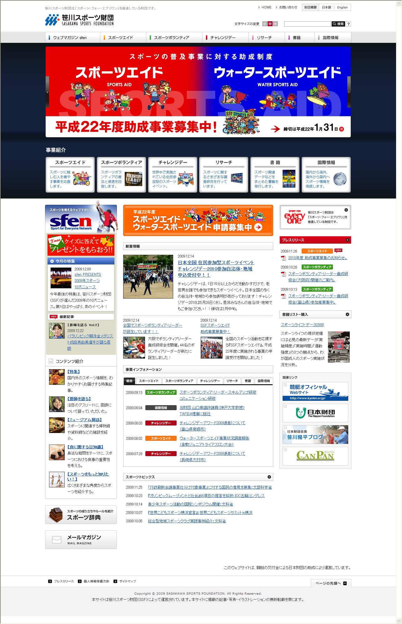 生涯スポーツ等の情報拠点整備 「インターネット総合スポーツサイト等の運営」 2.目的 本事業は、インターネットや刊行物等を通じ、全国のスポーツ振興関係者ならびにスポーツ愛好者に対し、国内外の最新のスポーツ情報を迅速かつ効果的に提供することによって、スポーツ・フォー・エブリワンの推進に寄与する。また、その推進機関である当財団の活動をより多くの方々に知ってもらうために、広報ミーティング等を開催し、周知・広報活動を行う。 3.内容 本事業は以下の内容を実施 ・SSF公式ホームページの運営 (2009年度に財団公式サイトとスポーツ情報サイトsfenを一本化) ・ SSF刊行物の頒布・告知 ・財団広報活動 ・ スポーツ関連情報収集・提供活動:各種セミナー、学会等での情報収集および提供(発表含む) ・システム管理 4.成果物 笹川スポーツ財団 公式ホームページ http://www.ssf.or.jp/index.html |