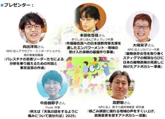 世界の一員である私たち一人ひとりも加担しているかもしれない“分断”を看過せず、平和と人権への思いを共有して乗り越えていく市民による取り組みが、草の根からグローバルまで続いています。本企画では、ソーシャル・ジャスティス基金の公募第13回による助成を受けたそういった市民のみなさんから、成果や効果、課題や展望を率直に発表いただきます。試行錯誤からの学びや、困難な中でも楽しさを感じられたエピソード等もみなさんと共有したいと思います。さらにパネル対話では、「共生とは何か」、「自分の中にある“偏見”に目を向ける」、「対立を乗り越えるために第三者が関わる意義」等のテーマで悩みを語り合います。公正な社会、ソーシャル・ジャスティスとは何かを見つめながら、課題解決に向けて市民が連携して声を上げられる新たな一歩になれば幸いです。