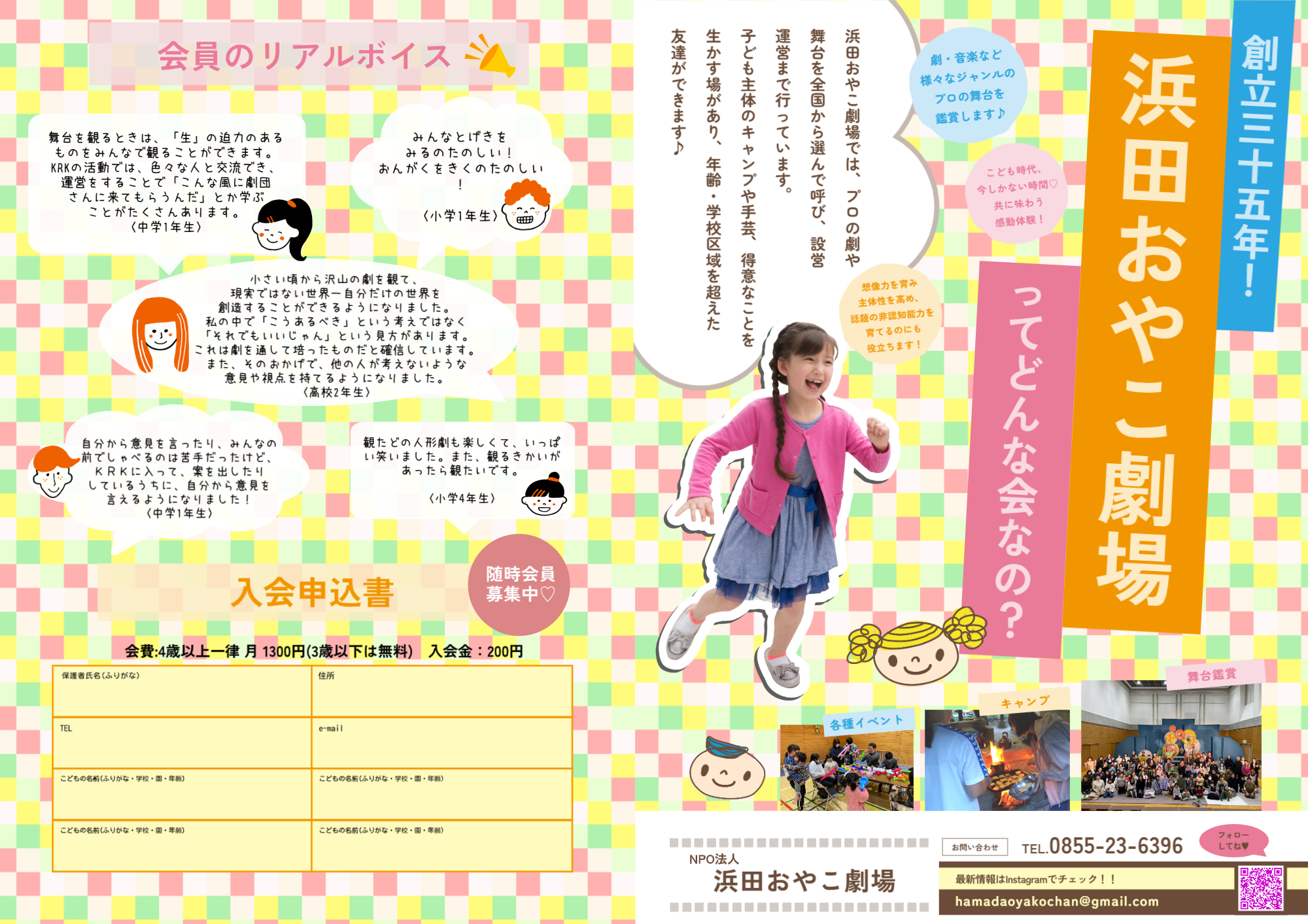 「浜田おやこ劇場」は今から35年前、浜田にUターンされた方が「劇場もなく、文化ホールもなく、子どもにお芝居も見せる事のできない所で子育てをしなければならない…浜田におやこ劇場が欲しい!」という思いから始まりました。1989年の発足記念例会から始まり、今年度は創立32年目になります。もっと身近に舞台芸術を楽しんでもらおうと地域で行う「地域公演」も実行委員会を立ち上げ、行ってきました。その他、子どもの諸活動として夏キャンプ、春・秋合宿、地域の達人講座、街中探険、文化事業として様々な講演会、学習会を開催。子育てサロンや中高生の居場所作り、青少年保育ボランティア養成講座などにも取り組んできました。