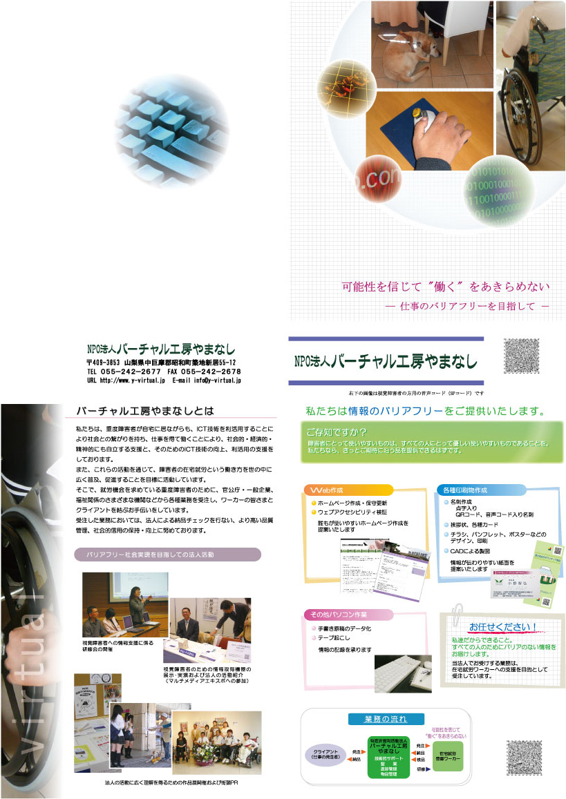 2、ICT学習センターの運営や学習会を開催し、障害者のICT技術向上のための支援。 3、障害者の在宅就労セミナーなどを開催し、地域の皆様に理解していただく活動。 4、情報のバリアフリー化を促進させるため、イベントなどに参加しての広報活動。 |