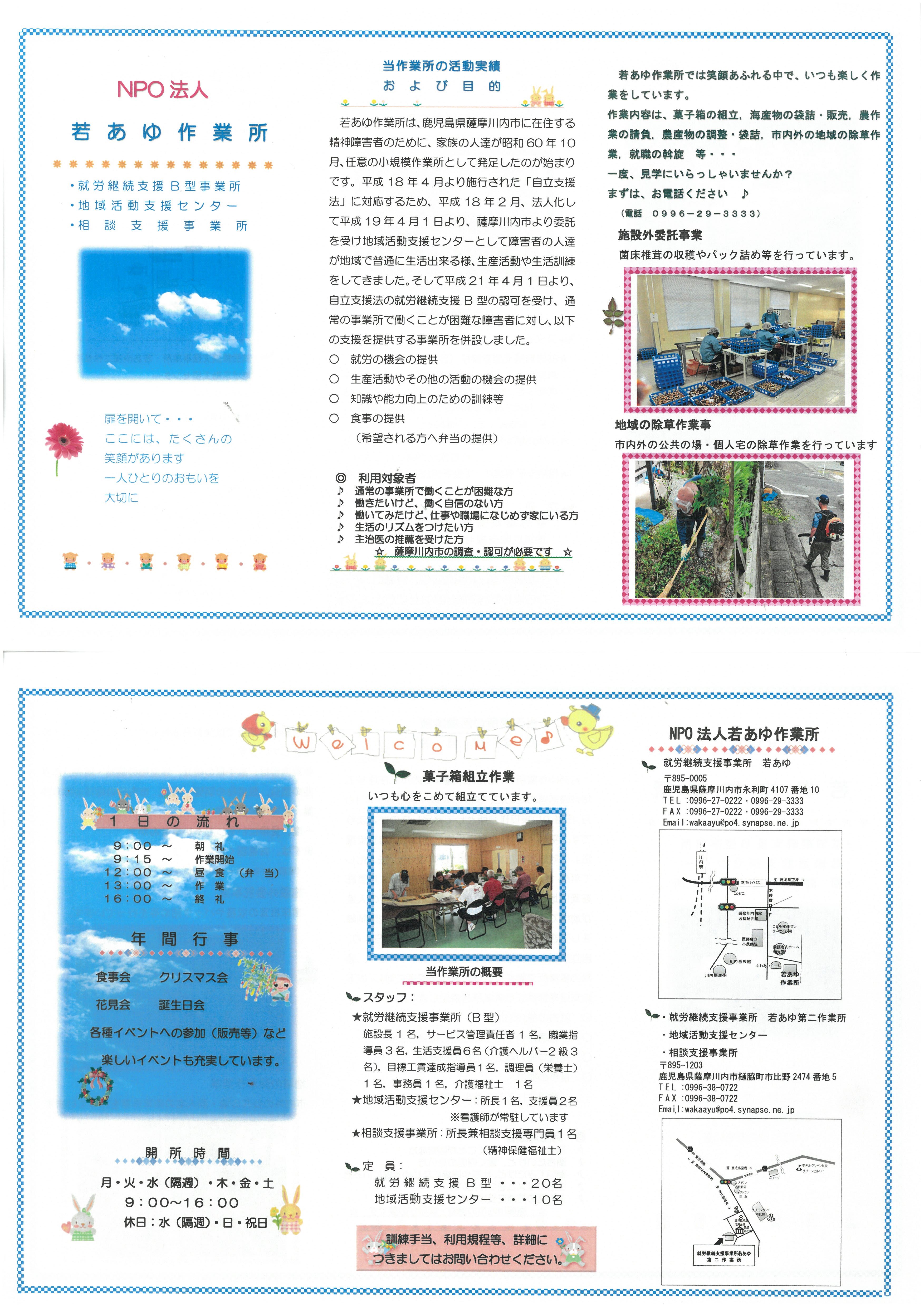 若あゆ作業所は,鹿児島県薩摩川内市に在住する精神障害者のために,家族の人達が我が子の幸せを願う親の思いを原点として,昭和60年10月に任意の小規模作業所として発足したのが始まりです。平成18年4月より施行された「障害者自立支援法」に対応するため,平成18年2月法人化し,薩摩川内市の委託を受け,地域活動支援センターとして障害者の人達が地域で普通に生活できる様,生活訓練や生産活動を支援してきました。平成21年4月からは自立支援法の就労継続支援B型の認可を受け,通常の事業所で働く事が困難な障害者に対し,生産活動やその他の活動の機会の提供,知識や能力の向上のためのサービスを行い,一般就労への足掛かりとなる様支援してまいりました。