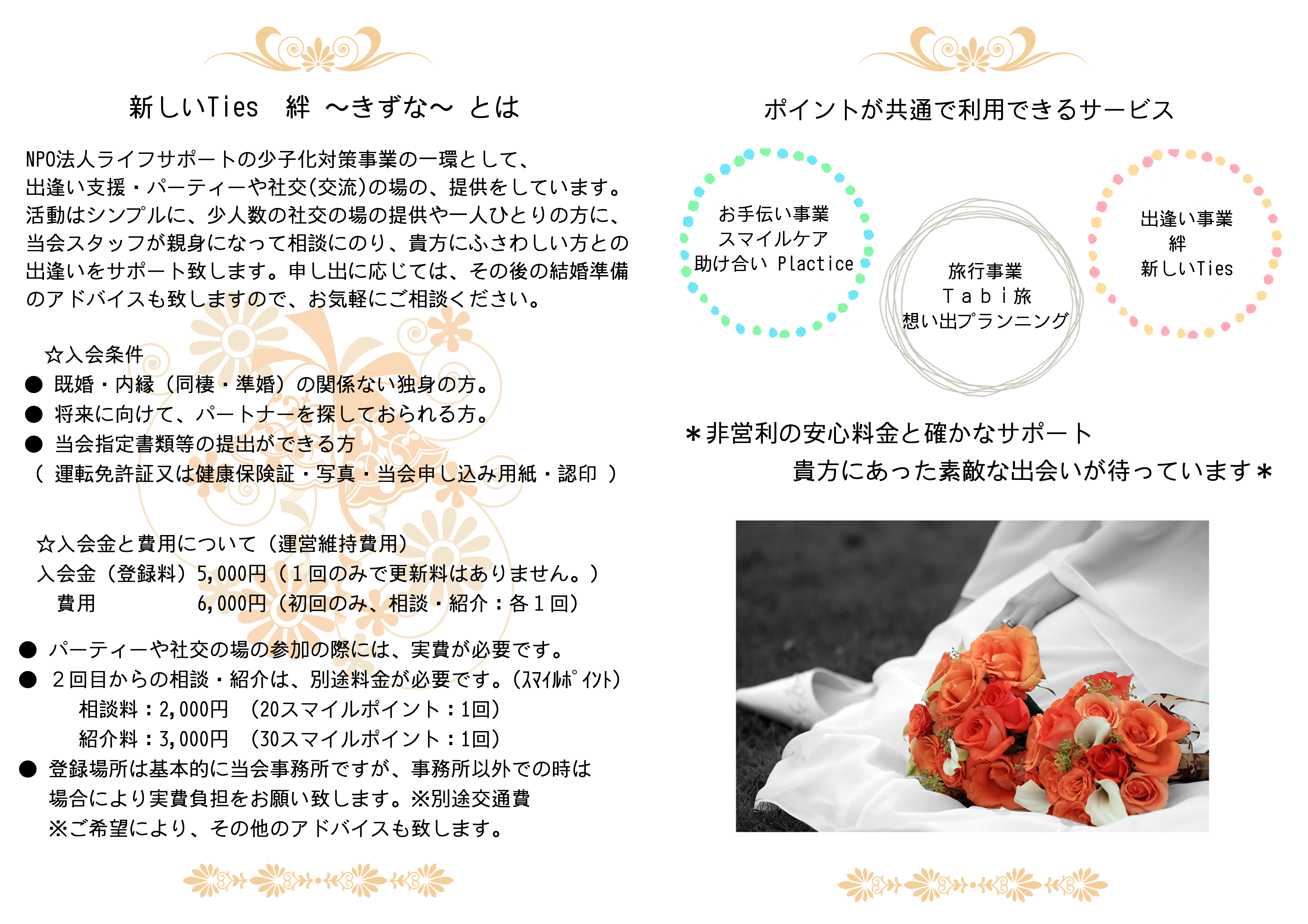 日常のお手伝いに対しての必要な知識習得や講習、講演会、研修会の参加や、実際に高齢者のご自宅に訪問しての実践経験を積んだサポート隊に対して、ボランティア証明書(行政との連携)の発行(特に大学生サポート隊)社会、就職などに役立つ状況にする。 高齢者や身体の不自由な方々(スマイル会員)が自宅や外出時において、手助けが必要だと感じている事に対してのニーズの調査。 看護師、介護士、サポート隊の同行する旅行の企画により、高齢者やお身体の不自由な方々やそのご家族の方々に旅行を通して日常生活のストレス発散や「生きがい」につながるようにする。 サポート隊・スマイル会員や地域の人々との交流、世代の異なる人達の考え、思いなどみんなで話せる場、新しいかたちの活動として交流会の実施し、地域の「絆」をつくる。 |