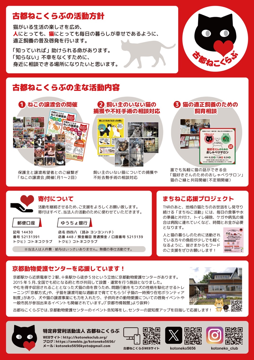 ◇京都市・京都府恊働事業「Kyoto-Ani-Love Festival(京都動物愛護フェスティバル)」参加。 ◇「公益財団法人どうぶつ基金」の協働ボランティアとして、飼い主のいない猫についての捕獲や不妊手術の相談対応。 ◇京都動物愛護センター認知アップのための応援。 ◇猫の適正飼養のための飼育相談・啓発。 ◇猫の保護活動ボランティアや猫の飼育者向けセミナーの実施。 ◇行政やその他の有効なサービス、助成金等の情報の広報実施。 |