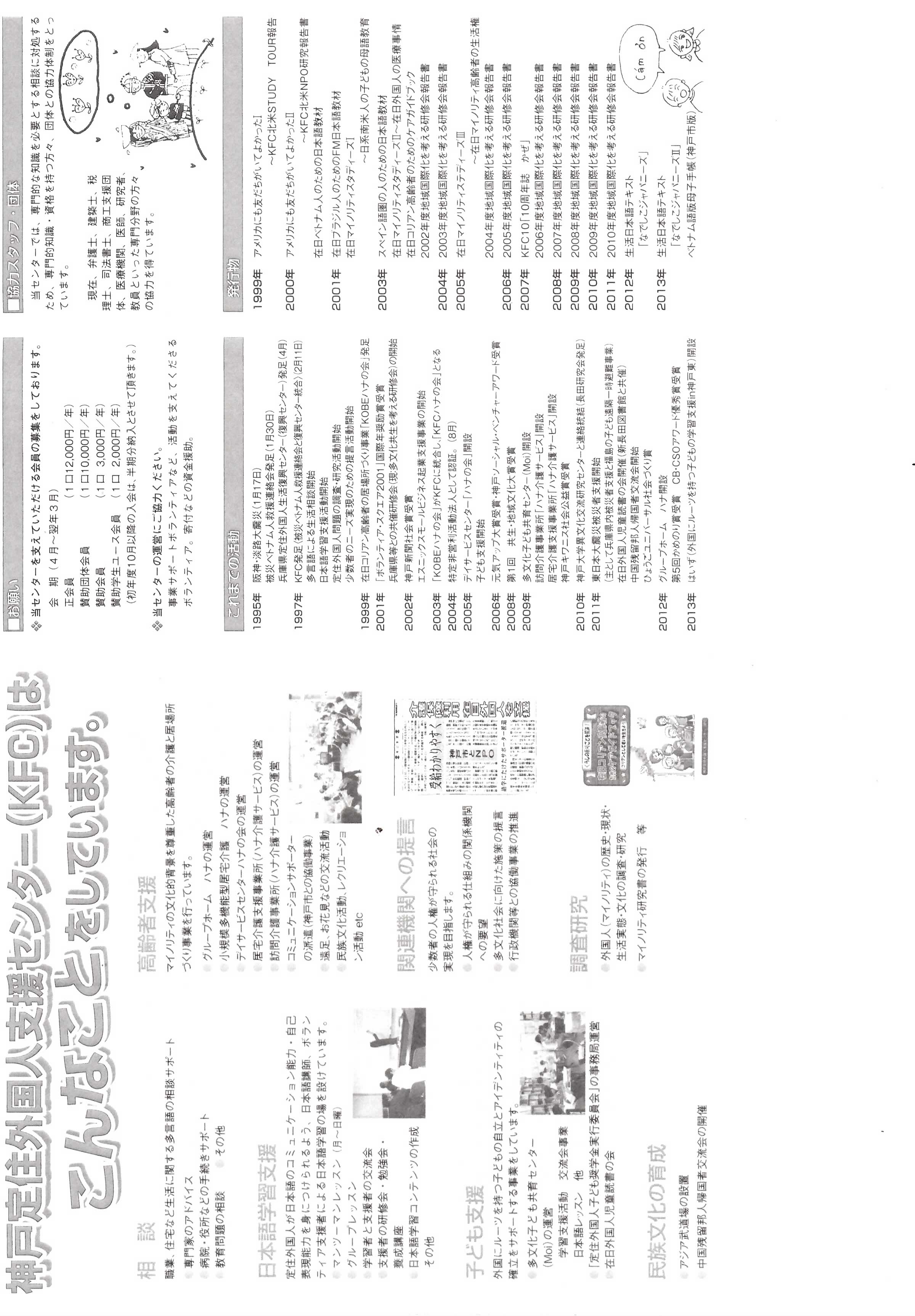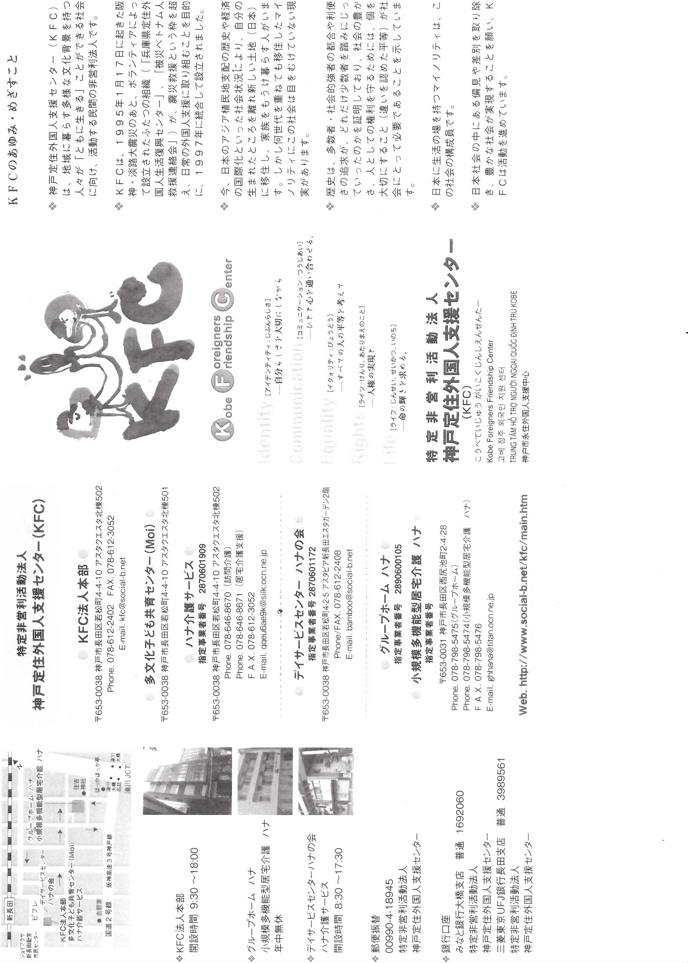 1997 神戸定住外国人支援センター(KFC)発足 日本語学習支援活動等開始 2002 兵庫県他と共催で「「多文化共生」を考える研修会」開始 神戸新聞社会賞受賞 2004 マイノリティ高齢者のための介護人材育成事業開催 特定非営利活動(NPO)法人として認証 2005 デイサービスセンター ハナの会開設 外国にルーツを持つ子どもの学習支援活動開始 2006 神戸市介護保険課と外国人高齢者のためのコミュニケーションサホ゜ーター派遣開始 2009 訪問介護事業所、居宅介護事業所を開設 2011 中国残留邦人帰国者等支援活動を開始 2012 グループホームハナ開設 2013 小規模多機能居宅介護ハナ開設 2015 第39回 井植文化賞受賞 第13回読売福祉文化賞 2015年度国際交流基金地球市民賞 2019 ふたば国際プラザ (管理運営受託) |