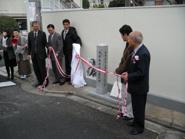 ご挨拶に代えまして、少し以前の活動報告ですが、ご紹介させていただきたいと思います。 平成20年12月25日、NPO法人となって最初の石碑建立の除幕式が行われました。 江戸時代にあった薩摩藩島津家の伏見屋敷跡です。 坂本龍馬は寺田屋で伏見奉行所方に捕縛されそうになり、深手を負わされましたが、間一髪抜け出し、その後かくまわれたのがこの藩邸です。 建碑場所を提供いただいた酒造メーカー様、ご寄付をいただいた方、当法人の理事長などにより紅白の紐が引かれました。 多くの皆さんのご協力により、新しい史蹟が生まれた瞬間です。 その後も、建碑活動を継続し、任意団体当時も含めて、計6基の石碑を建立いたしました。 これらの石碑につきましては、順次ご紹介をさせていただきたいと考えています。 |