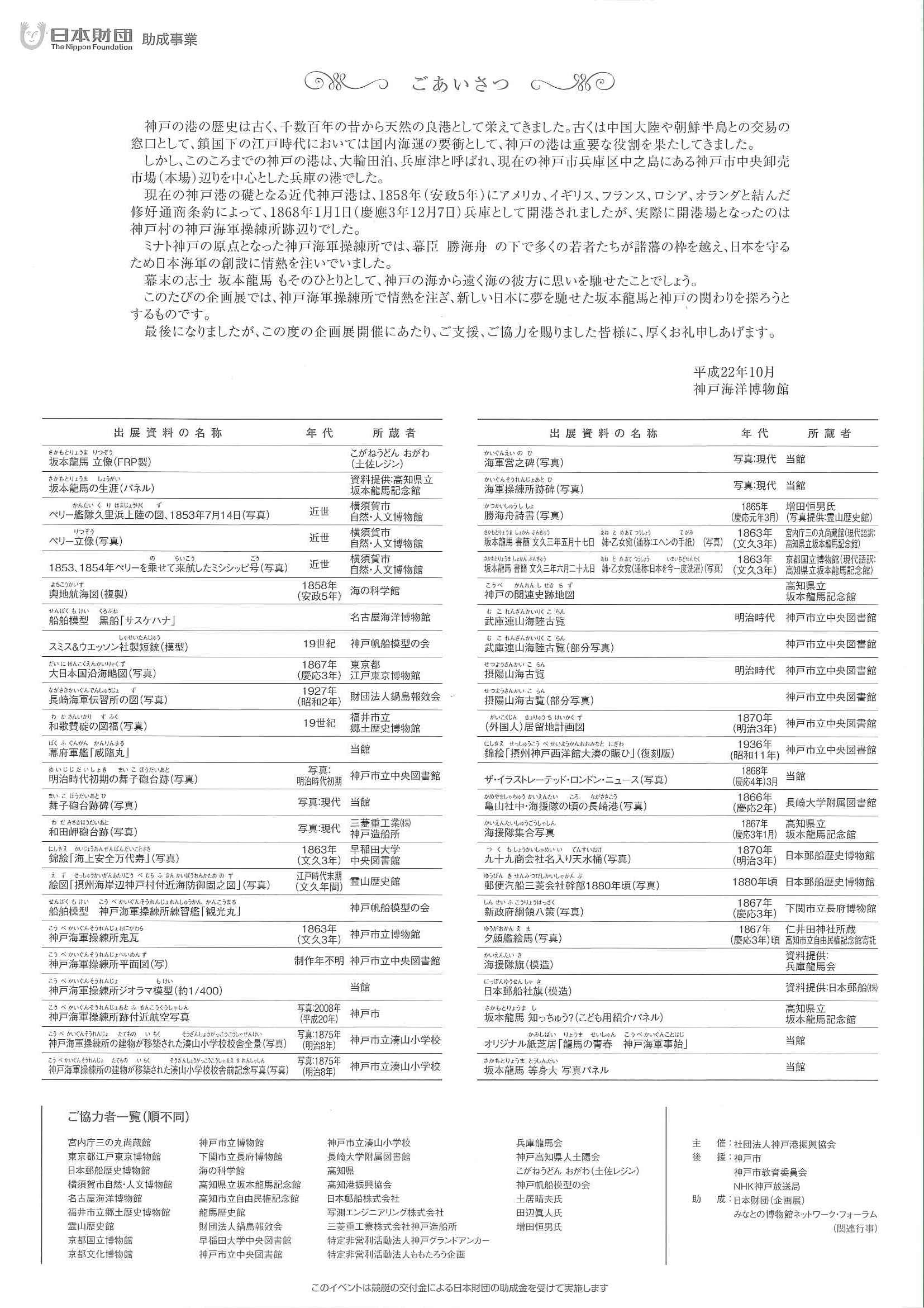 2010年度 海と船の企画展「ミナト神戸の原点を探る~坂本龍馬と神戸~」出展目録裏面