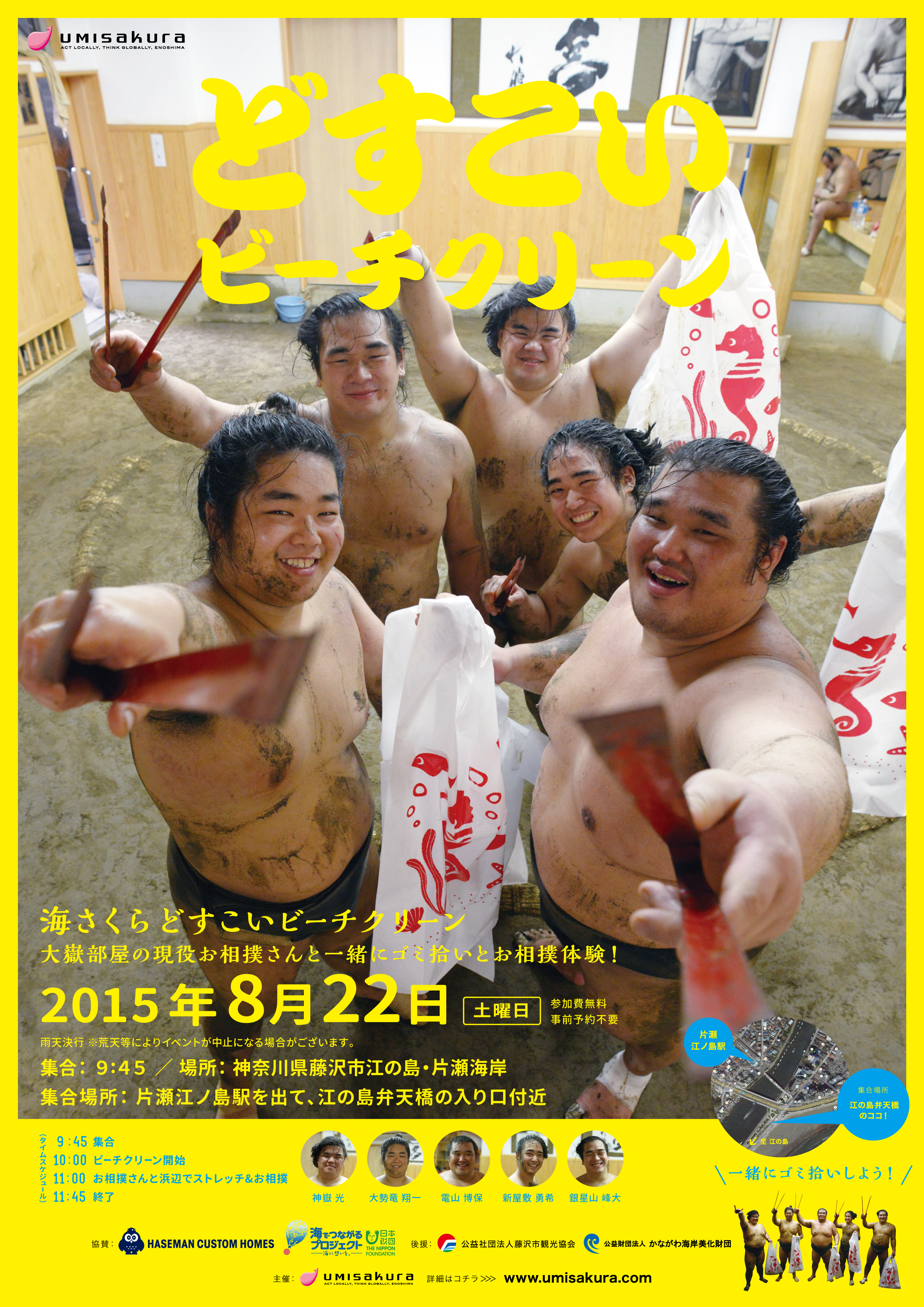 事業内容: 【日時】2015年8月22日(土) 【場所】神奈川県藤沢市江の島の片瀬海岸 【内容】大嶽道場大嶽部屋所属の現役力士5名、大嶽親方、女将さんの合計7名を招き、神奈川県江の島の片瀬海岸にて、一緒にゴミ拾いをした後、ゴミがなくなった浜辺で力士による相撲健康体操で準備運動したあとに、実際に力士とチビッ子による相撲を実施。 【参加人数】約250名 事業目標の達成状況: 海に関心をもってもらうため、「楽しい」をキーワードに、 大嶽部屋の現役力士をお呼びしてのイベント開催は、約250名もの参加がありました。 大人が出したゴミで汚れた浜を、子供達がケガ無くお相撲をとって遊べるように必死にゴミを拾い、 子供達は、キレイになった浜で、砂まみれになり浜を感じたり、海の匂い・風を感じながら、相撲をしました。 子供たちは、笑顔にあふれ、その笑顔を見て大人達も笑い、海をキレイにしていくことをおしつけがましくない形で、伝えることができたと思います。 また多くのメディアも取材にきてくれ、現場でのイベント以外にも、街と海との距離、海の大切さを伝えられたと思います。 |