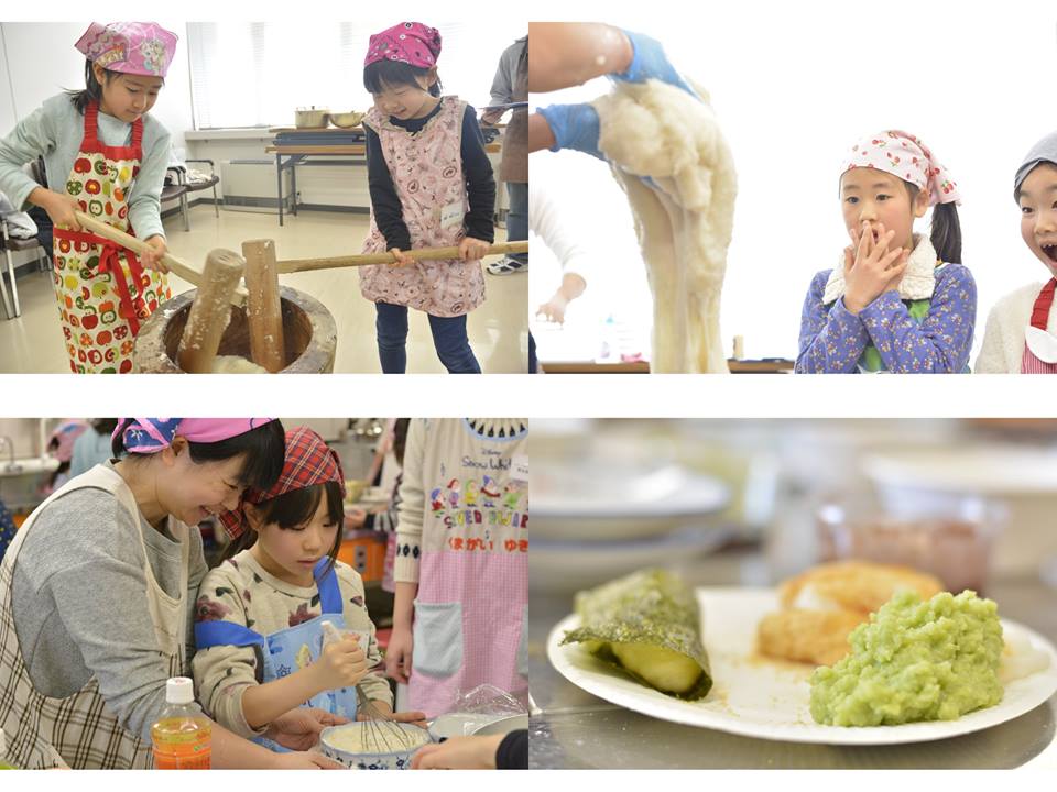 今回の教室は『餅つき』をしました。本物の杵と臼を使っての餅つきです。昨今、『餅を搗く』事自体が大変難しく、“機会”自体があまりないですよね。初めて餅を搗く子もたくさんいて、『餅がのびる』という事、『もち米がお餅になること』に興味津々で驚く子がたくさんいました。 やっぱり、“搗き立て”の餅は美味しいですね~。 プニュプニュのやわやわ(笑) そのままでももちろん美味しいですが・・・今回は、きな粉、あんこ、いそべ、ずんだの4種類の中から好きなものを選んでもらって、搗きたてのお餅を味わってもらいました!! また、搗き立てのお餅を使って『もち料理』にもチャレンジ!! メニューは、『仙台風雑煮』と『もちもちパンケーキ』or『もち玉焼き』。 雑煮は、本場仙台風のつくり方を紹介し、前日までに仕込んでおいた“引き菜”や、寒晒しの高野豆腐、芋茎や、セリなど、文化・歴史面も子供たちに学んでもらいました。 芋茎(いもがら)は、お母さんの中でも初めて使う!!という人もいて、やはり、こういう食文化がどこかで、誰かの手で知られ、それが次の世代に続いていくのだと感じました。 もちもちパンケーキは、ホットケーキミックスとお餅を合わせた料理で、お餅を入れることで、生地の膨らみもまし、もちもちで厚みのあるパンケーキが出来上がります。 もち玉焼きは、餅と卵だけで出来る簡単な料理ですが、見た目もお好み焼きにそっくりで、忙しい朝や、小腹がすいた時にもピッタリな一品♪ 最後は、子供たちと一緒に、餅つきや雑煮に入っていた食材、宮城の名物・食材などをクイズにして一緒に学び、楽しいひと時を過ごしました!! |